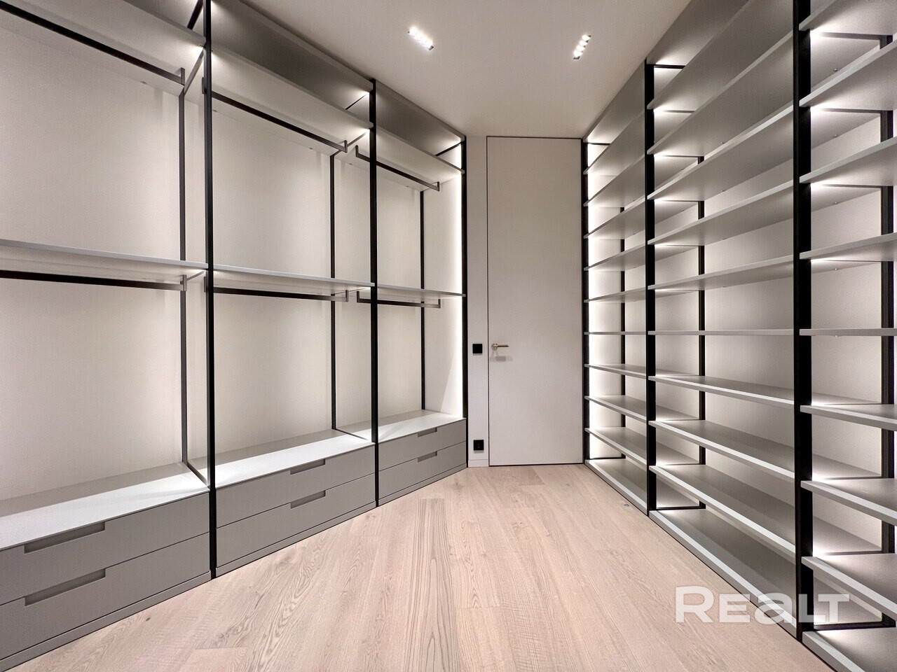 На первом этаже оборудованы четыре спальни, ванная комната, кабинет и гардеробные.