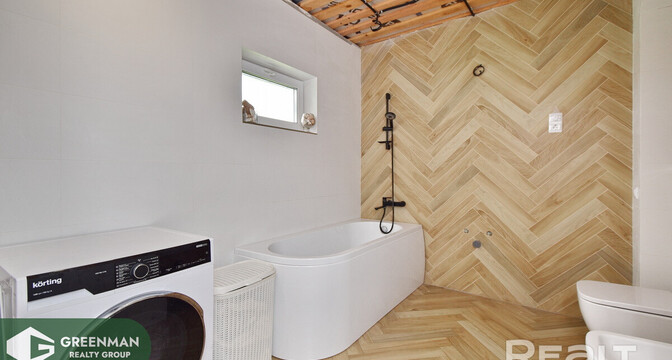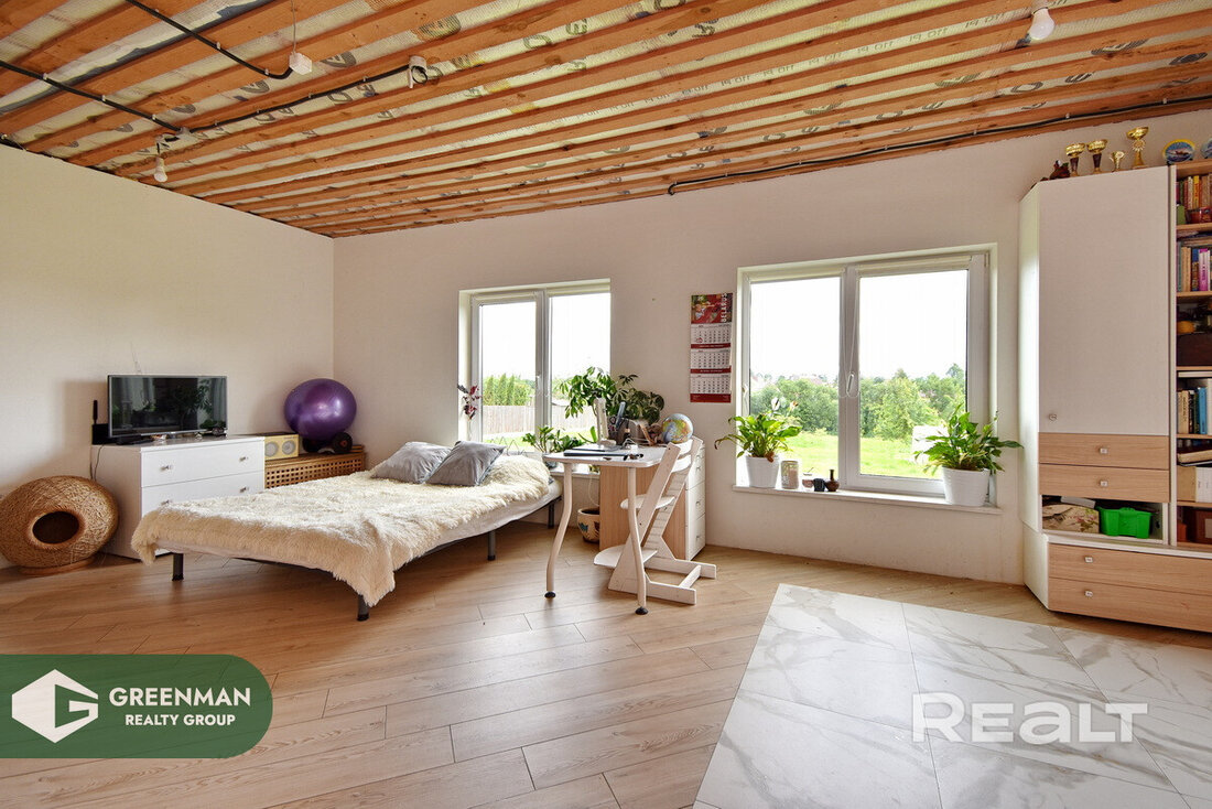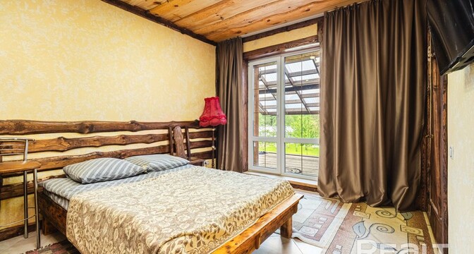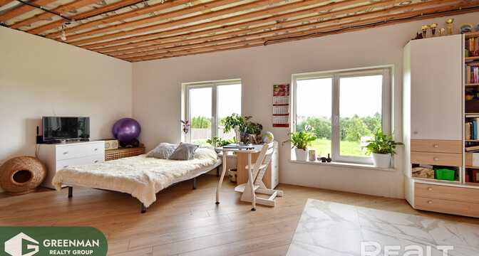 В нем 5 отдельных спален, гостиная, кухня, два санузла, топочная, гардероб (с погребом). На чердаке можно оборудовать еще комнату. С обратной стороны дома — терраса.
