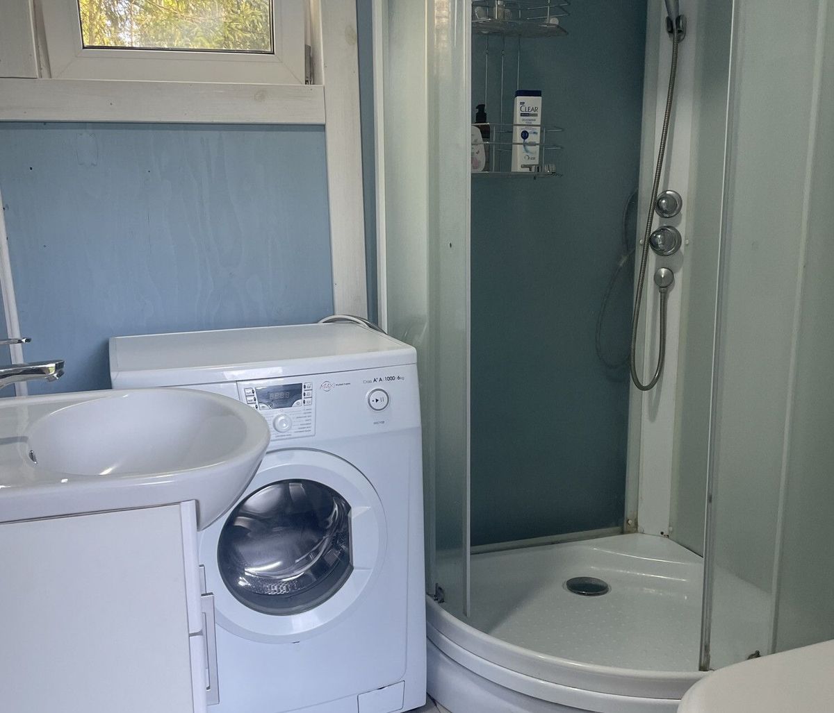 Санузел общий. Здесь разместили душевую кабину, унитаз, умывальник и стиральную машину.