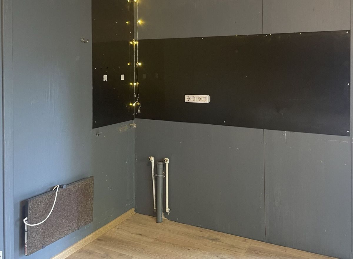 В зоне кухни сделан фартук, под предполагаемую мойку выведены канализация и водопровод (трубы горячей и холодной воды).