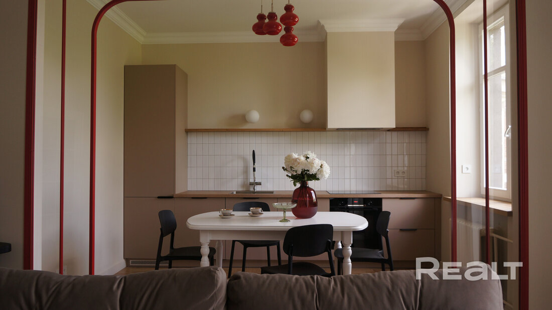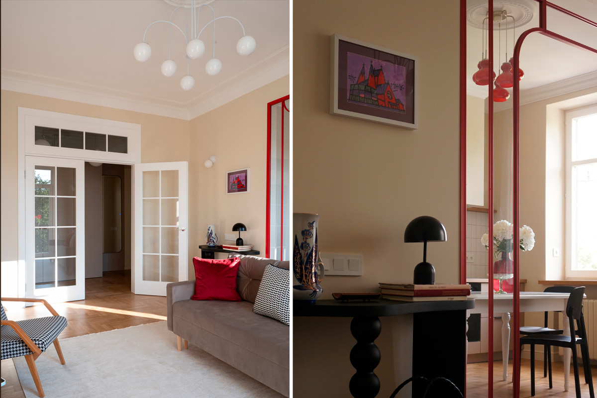 Яркий акцент — необычная перегородка красного цвета между кухней и гостиной. В таком же тоне висит и люстра над обеденным столом.