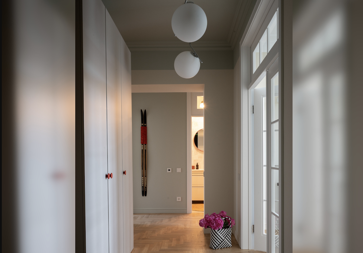 В квартире немаленькая прихожая, ее площадь — 11 квадратов. Здесь установлены вместительные шкафы с продуманной системой хранения и акцентными ручками того же красного цвета, есть зеркало с подсветкой. А еще интересный элемент, который гармонично вписали в интерьер — лыжи на стене.