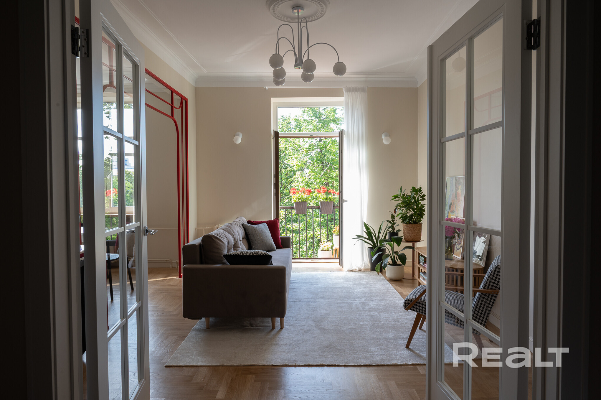 Для любителей сталинок — новый вариант на Realt. В продаже появилась двухкомнатная квартира в Воротах Минска напротив вокзала. Жилье действительно уникальное — идеальный интерьер с продуманными деталями и картинами белорусских художников, просторные комнаты с высокими потолками, локация, откуда легко добраться в любую точку Минска. Из интересного и необычного — в интерьере сохранили лыжи, которые нашли во время ремонта. Рассмотрим эту квартиру.