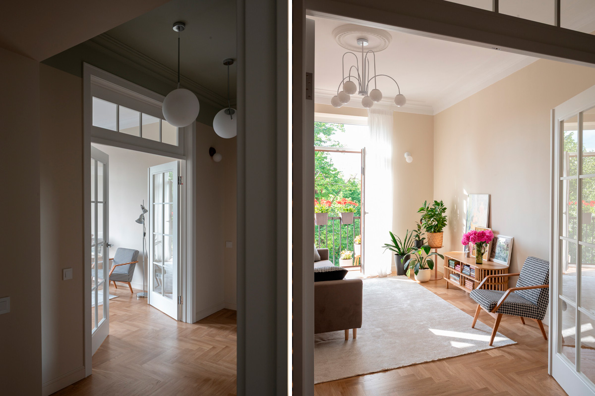 Интерьер выглядит так, словно мог бы посоревноваться в дизайнерских конкурсах и оказаться на обложке журнала. Ремонт стильный и актуальный, но при этом в квартире сохранили и подчеркнули атмосферу сталинки — здесь аутентичная лепнина, натуральный дубовый паркет, уложенный елочкой, винтажные светильники. Ну и — дело для сталинки привычное — в квартире трехметровые потолки.