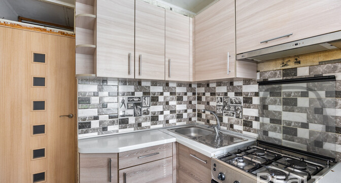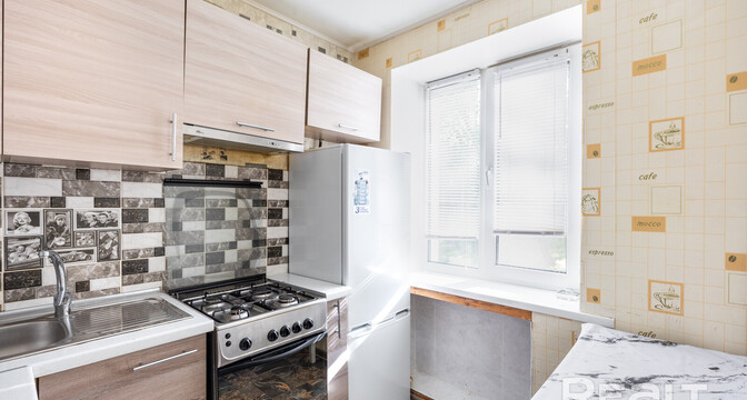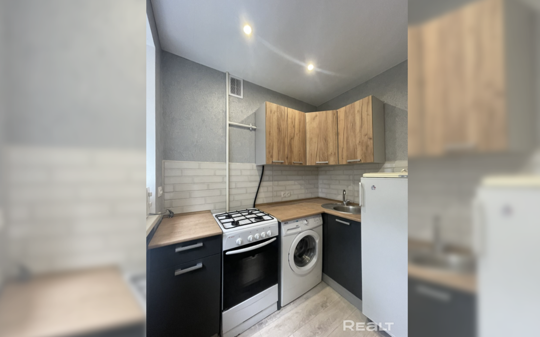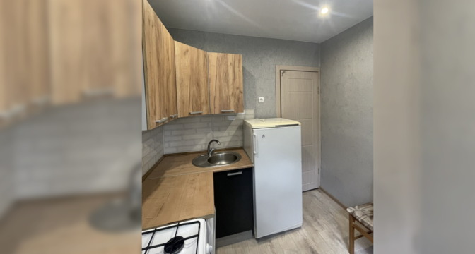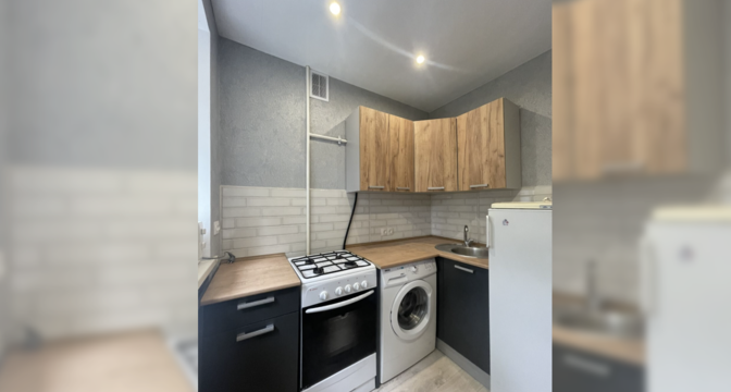 Общая площадь квартиры — 28 квадратов, 17 из них жилые. Метраж кухни — 5 квадратов. В квартире есть мебель и техника на первое время — шкафы в прихожей и жилой комнате; холодильник, газовая плита, вытяжка и духовой шкаф в кухне; стиральная машина в совмещенном санузле. В жилой комнате есть выход на застекленный балкон.