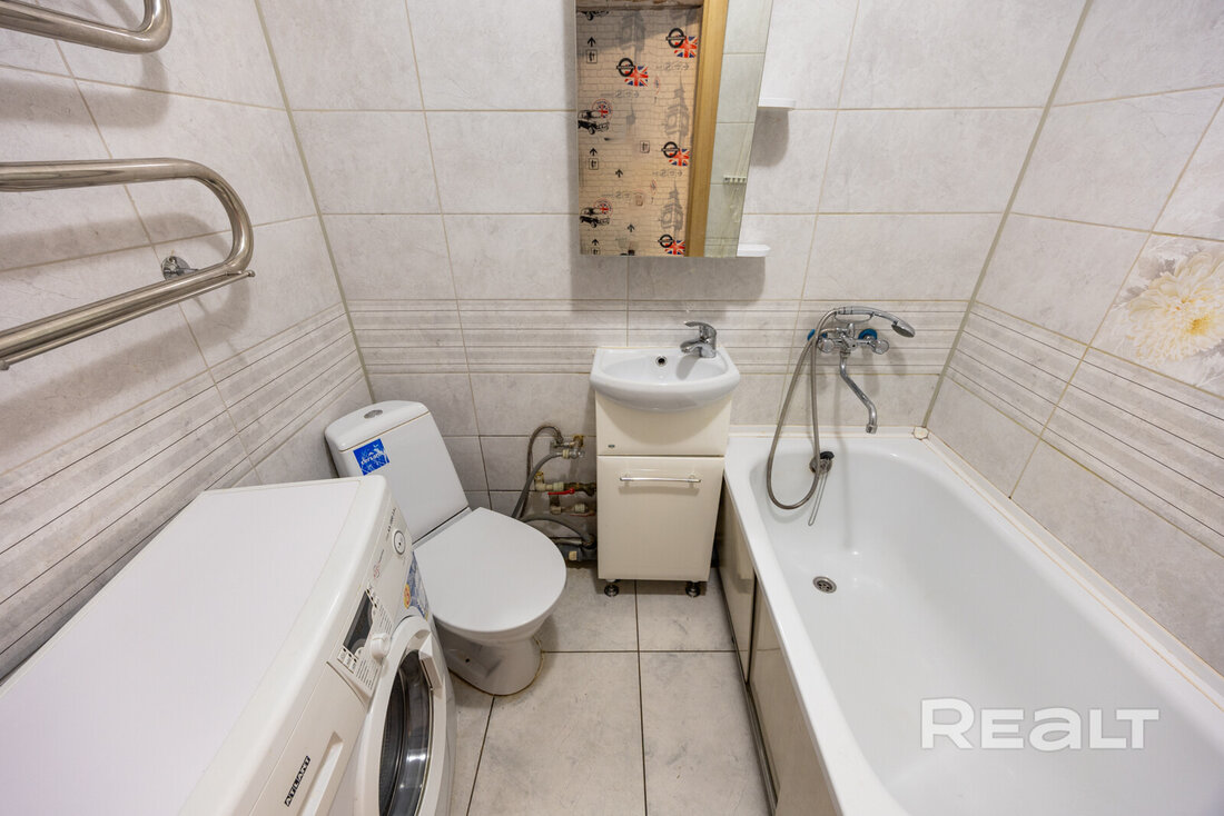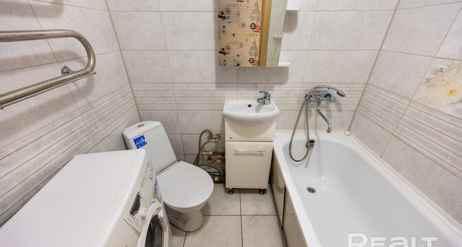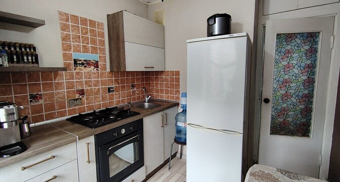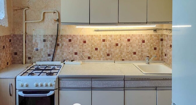 Общий метраж квартиры — 31 квадрат, 20 метров жилые. Площадь кухни — 6 метров. В квартире светлый ремонт. В жилой комнате стоит диван и шкаф. В кухне есть холодильник, духовка и плита, здесь же подключена стиральная машина. В совмещенном санузле установлена ванна.
