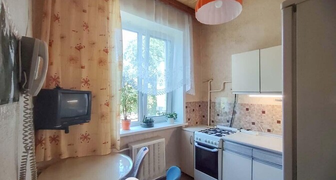 Общая площадь квартиры — 34 метра, половина из них жилые. Площадь кухни — 7 метров. На полу в жилой комнате ламинат, в коридоре и кухне — линолеум. Установлены стеклопакеты. Санузел совмещенный. Установлен бойлер и стиральная машина.