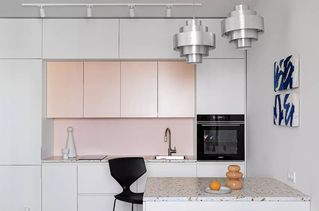 Многие арт-объекты в квартире выполнены белорусами. На стенах висят работы Михаила Гулина и Екатерины Пашкевич, а также декоративные панно Валерии Каплан. Кухонная столешница с отделкой терраццо тоже была изготовлена вручную белорусскими ремесленниками.