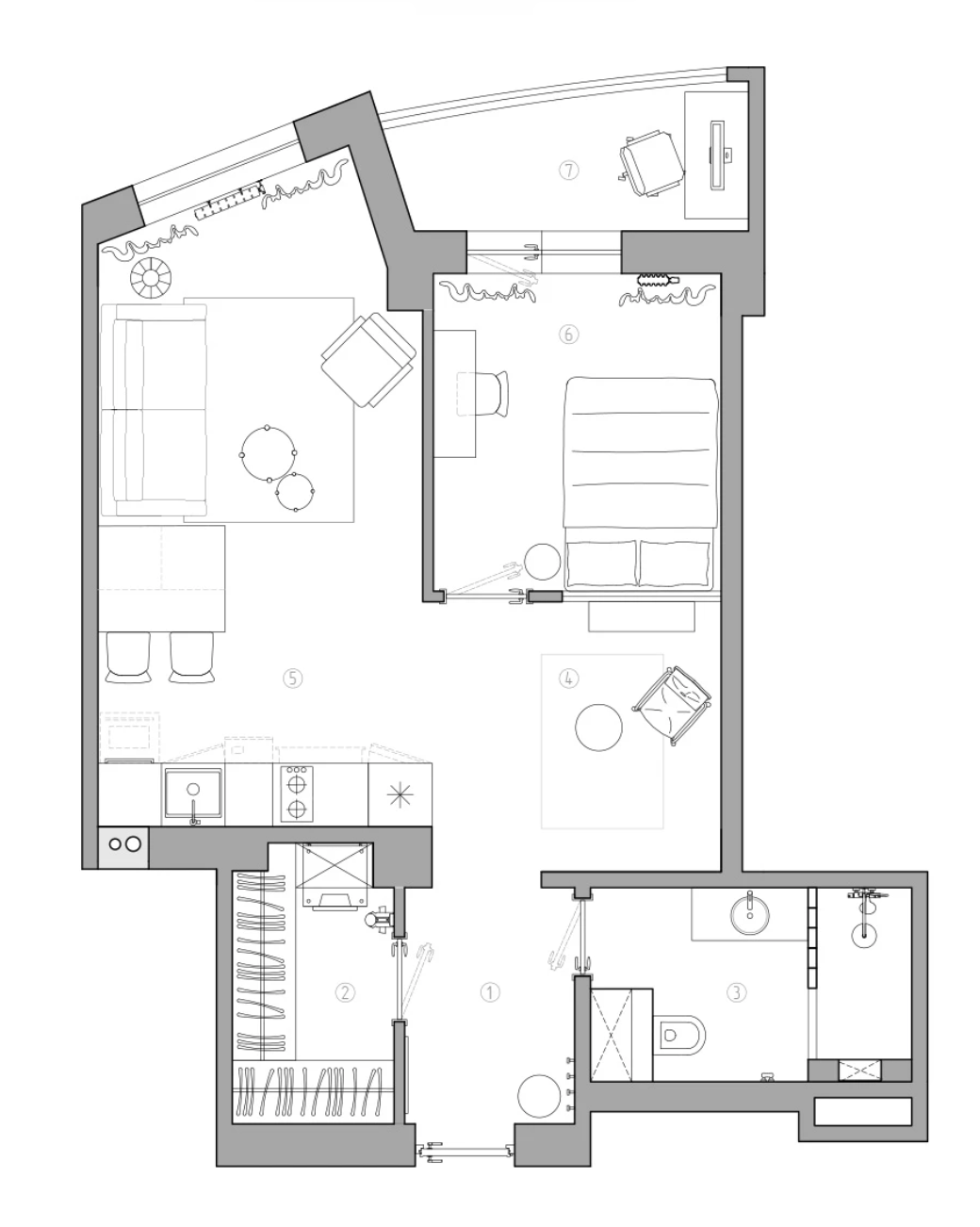 В итоге на площади в 51 квадрат организовали прихожую, кухню-гостиную, спальню, гардеробную, фотозону со световым окном из спальни, ванную комнату с просторной душевой и рабочий кабинет на лоджии.