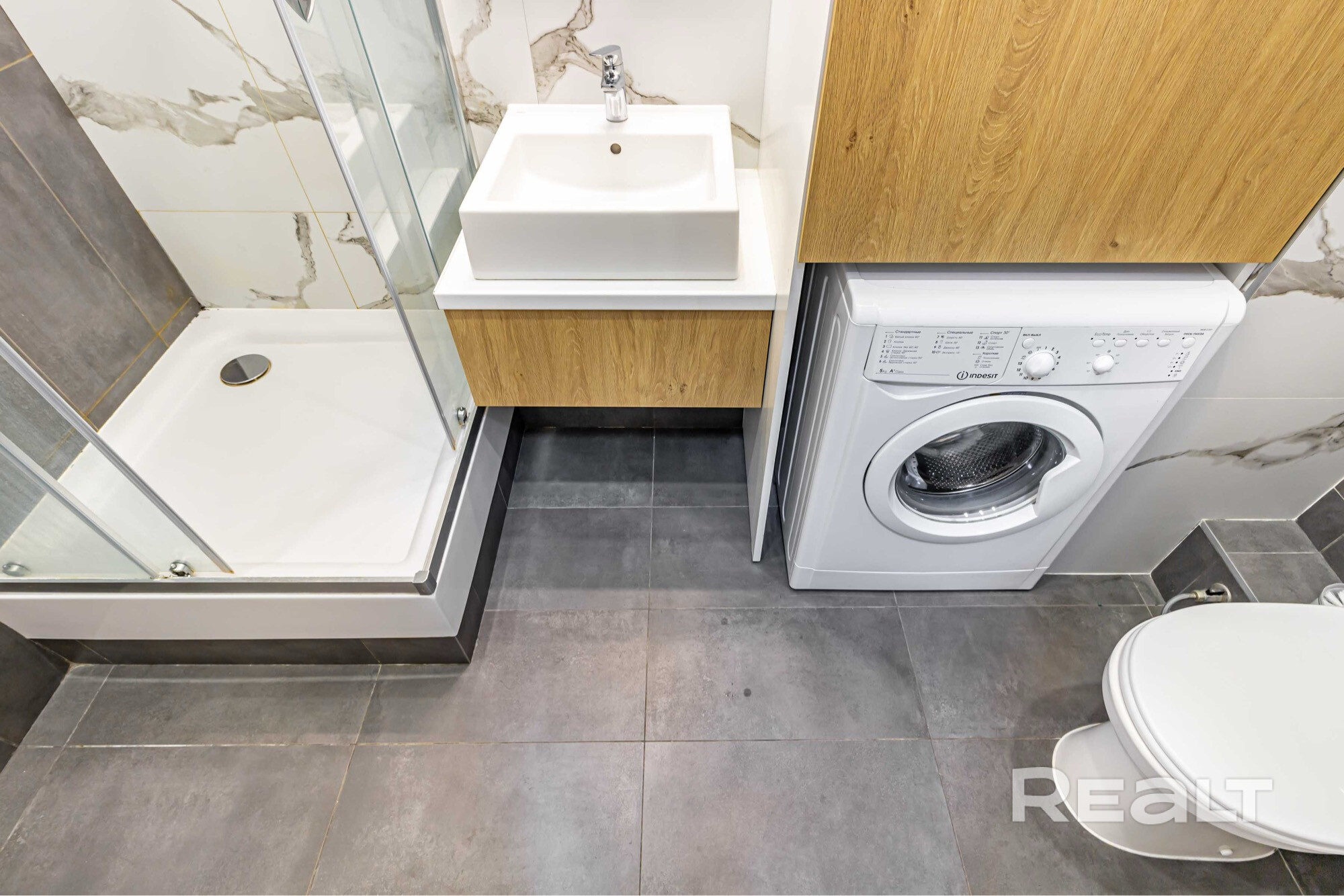 В ванной комнате установлена душевая кабина и стиральная машинка.