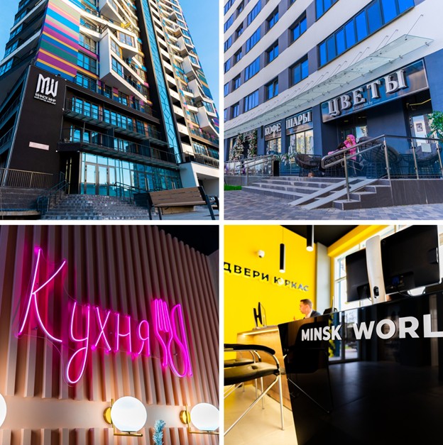 В нежилой части дома 1 этажа расположены 4 административно-торговых помещения. Коммерческие помещения в уже построенных домах многофункционального комплекса «Минск-Мир» — прекрасная возможность стартовать практически в любом сегменте бизнеса или развить уже существующий проект.