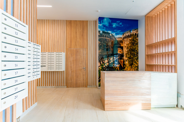 На 1 этаже жилой части дома располагается просторное дизайнерское лобби площадью 72 квадратных метра, санитарная комната с пеленальным столиком для малышей и мам, вспомогательное помещение для персонала, следящего за чистотой и порядком в доме, место для хранения колясок и велосипедов площадью 23 м2. Высота потолка (до низа перекрытия) — 4,5 м.
