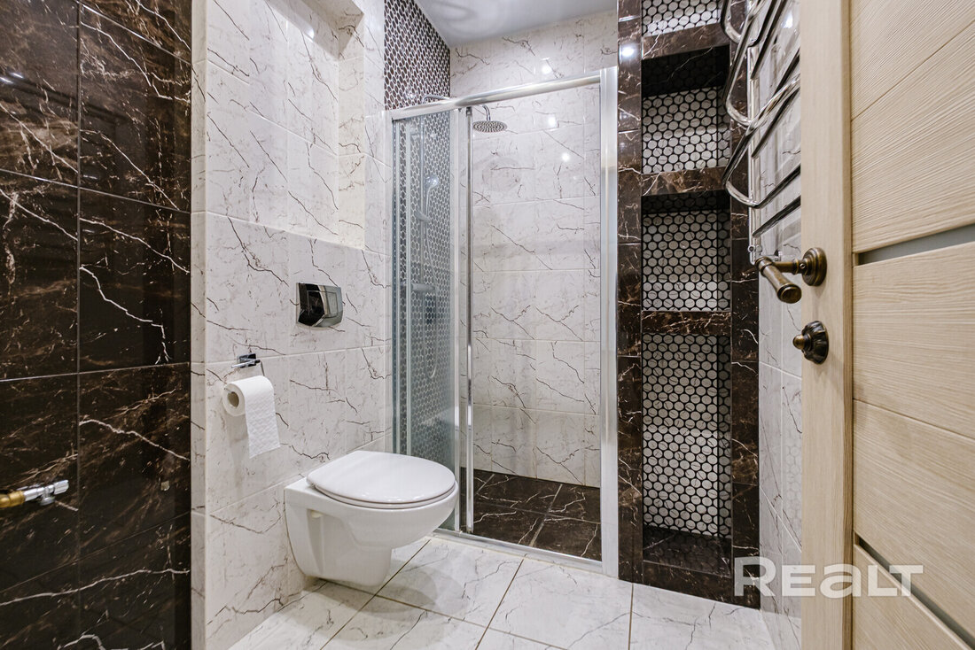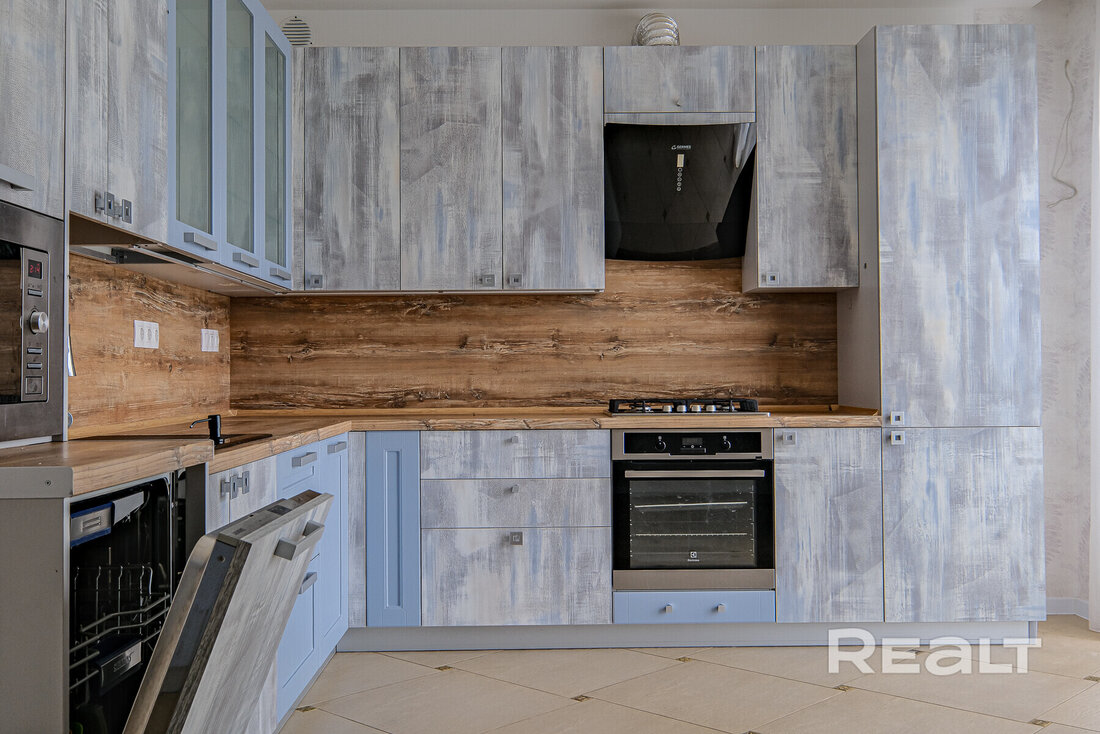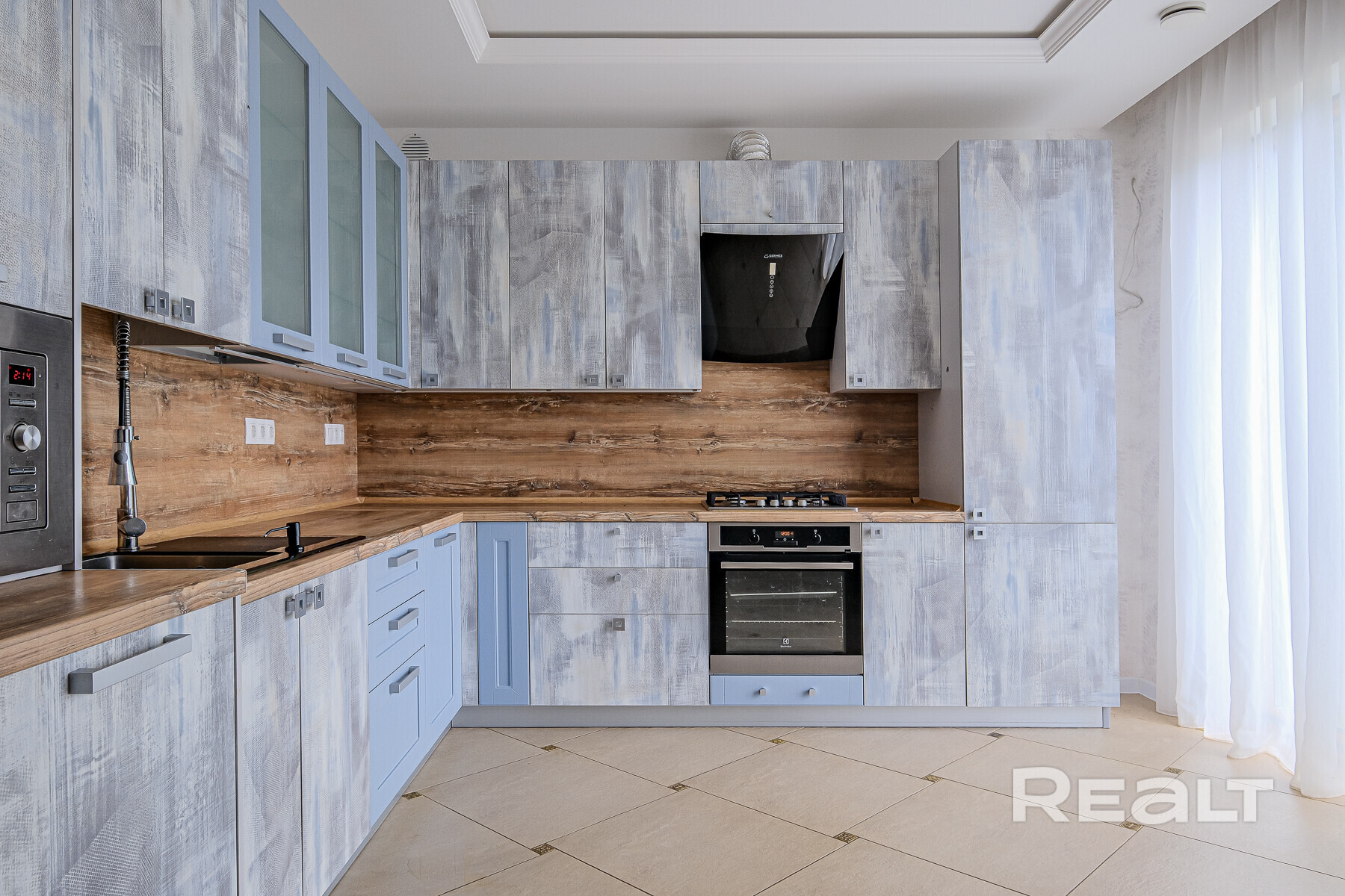 Во внутренней отделке использованы материалы искусственный камень, лиственница, бамбук, итальянская плитка. На кухне — встроенная техника Siemens, Electrolux.