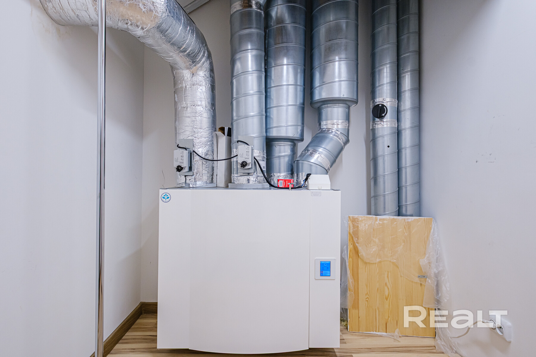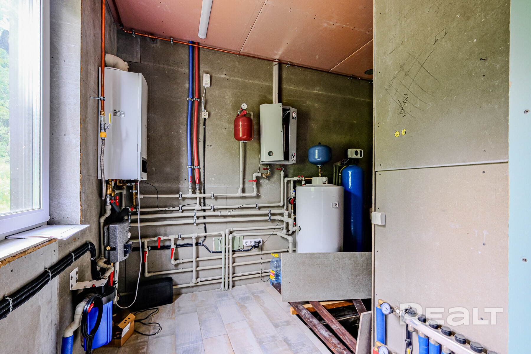 Отопление на газу с котлом Buderus, теплыми полами и радиаторами. В системе есть резервный электрокотел Kospel. Установлен бойлер косвенного нагрева и электротеном. В доме приточно-вытяжная вентиляция с рекуперацией Systemair (Швейцария), обеспечивающая приток и очистку воздуха с регулируемой температурой. Вода из скважины, канализация местная — три переливных колодца. Смонтирована ливневка.
