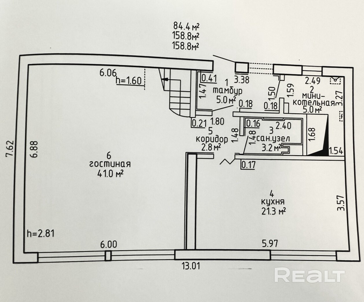 Общая площадь — 158,8 м2. На первом этаже находятся кухня, гостиная, санузел, топочная и тамбур.