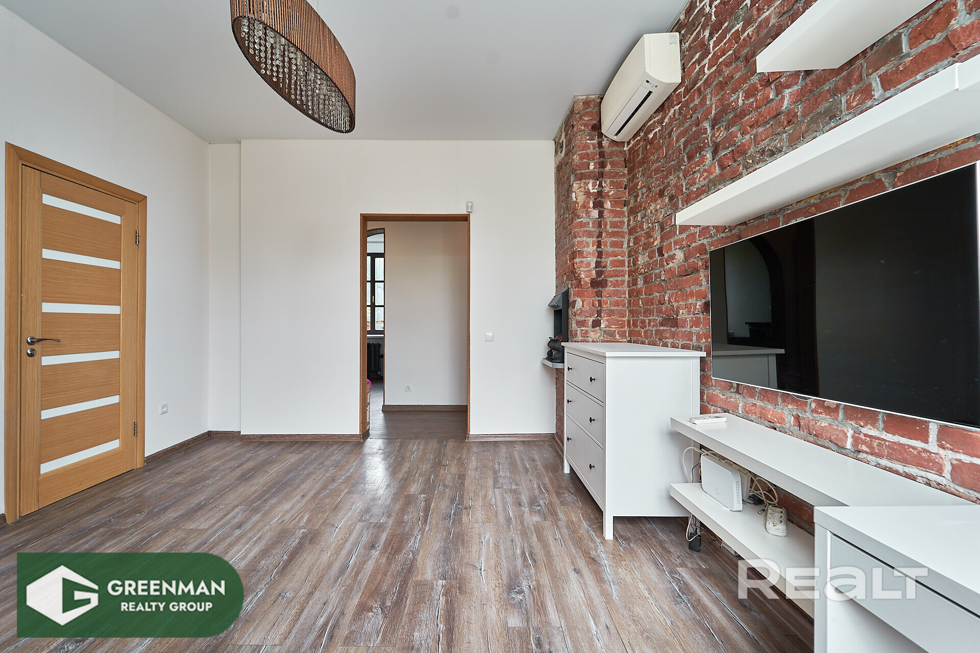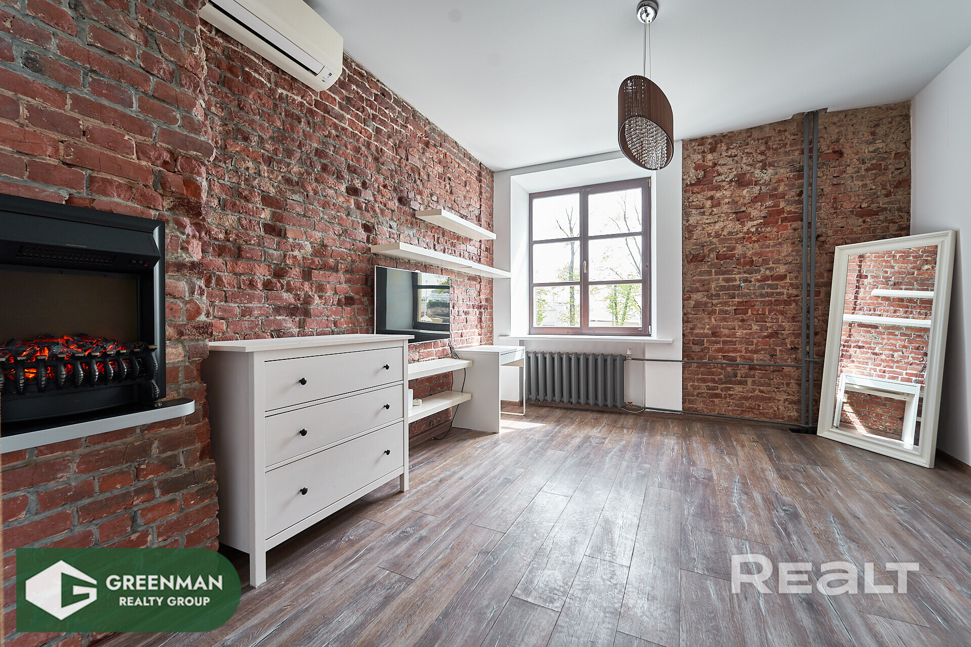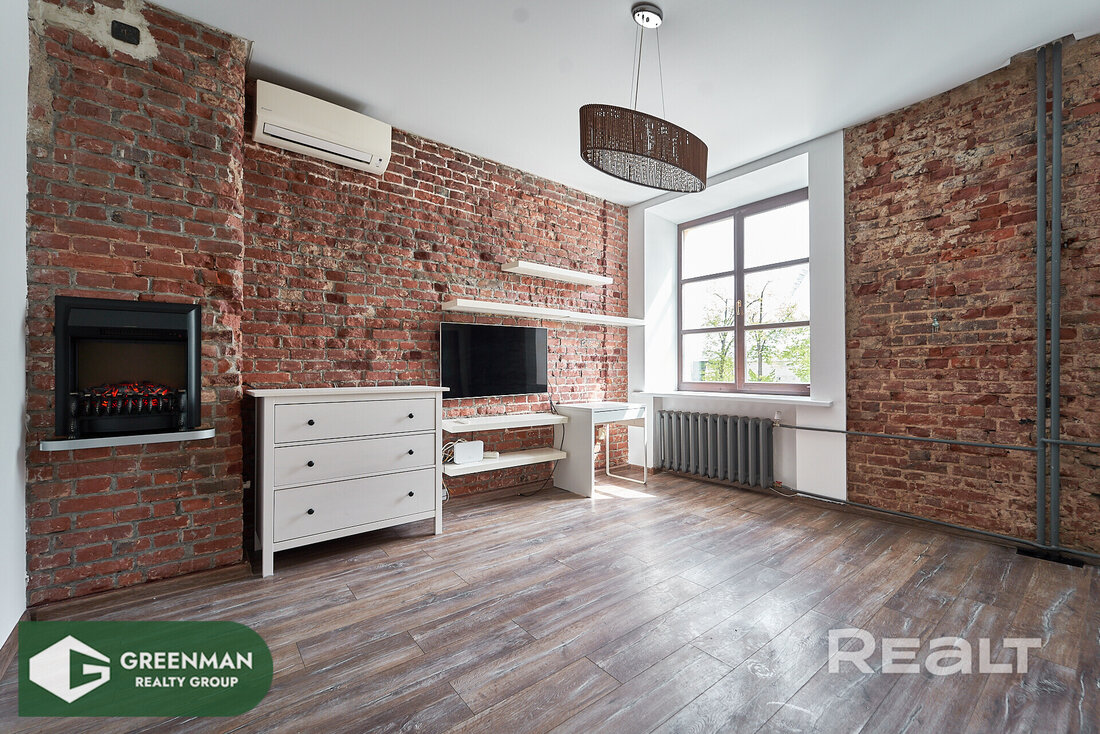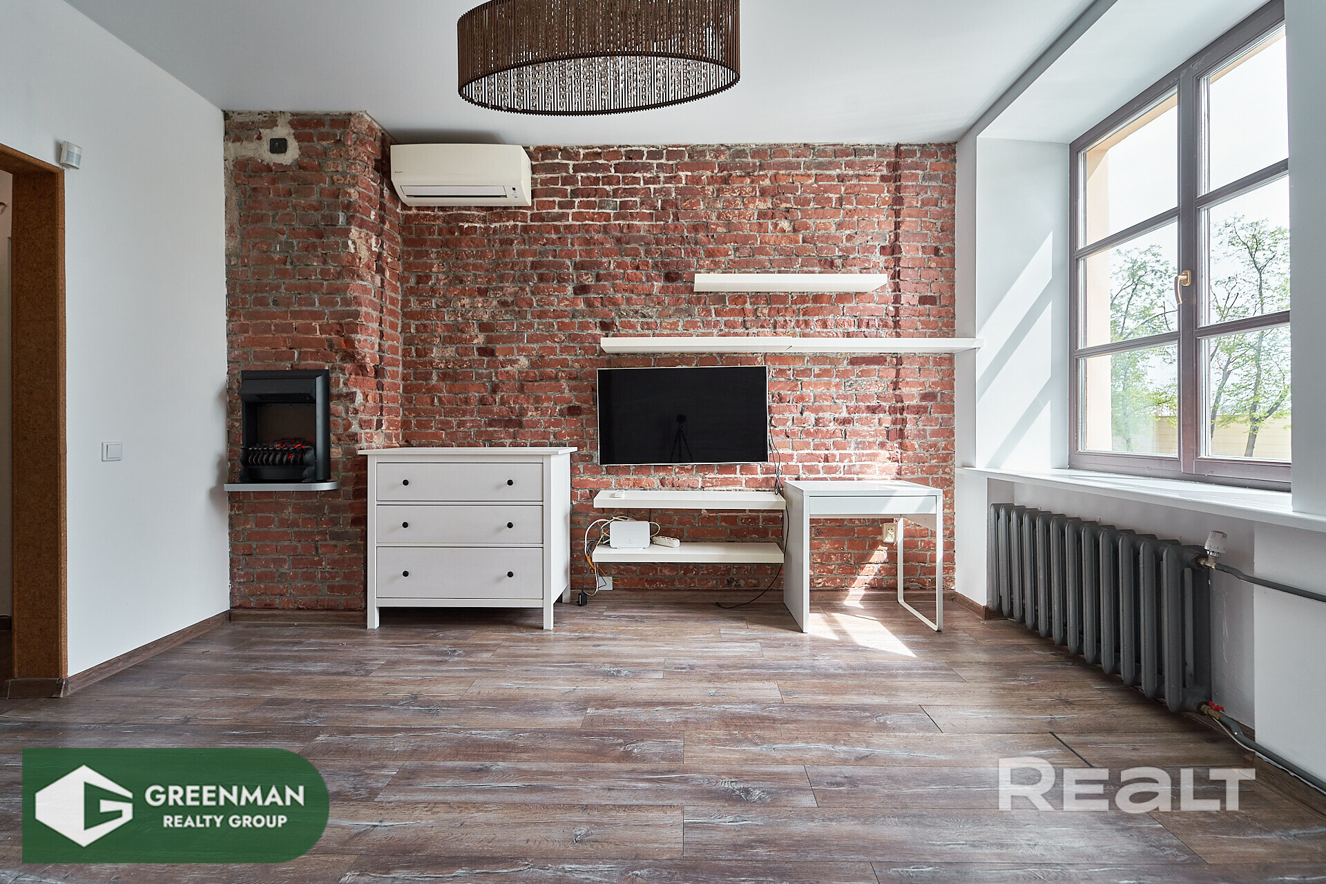 Во всех комнатах частично сохранили кирпичную кладку на стенах. В гостиной в стену вписан камин. В этой же комнате установлен кондиционер.