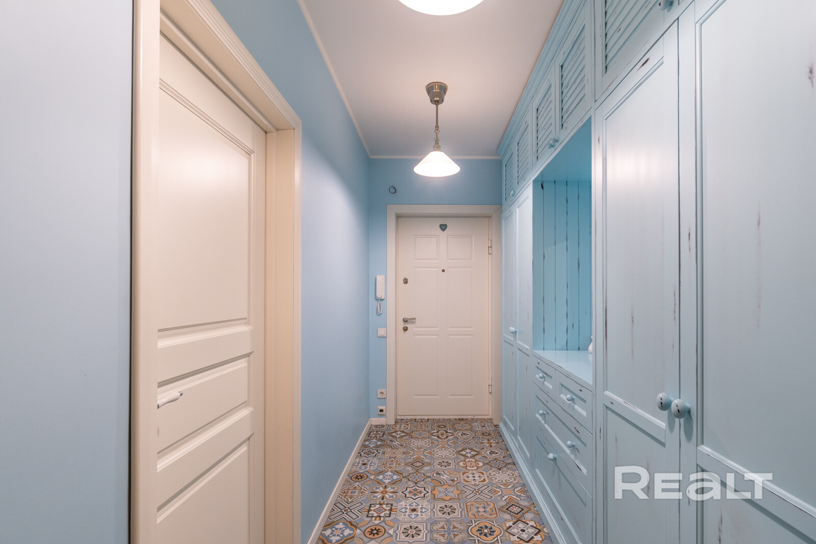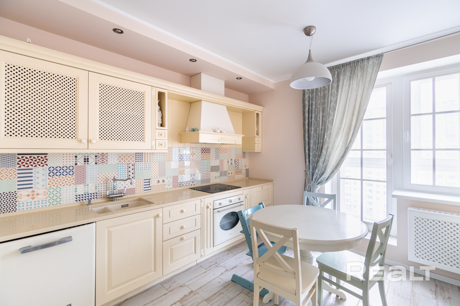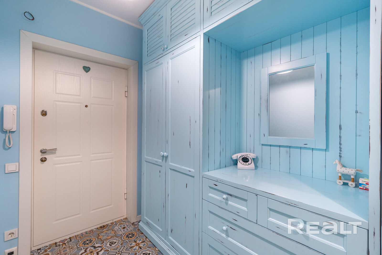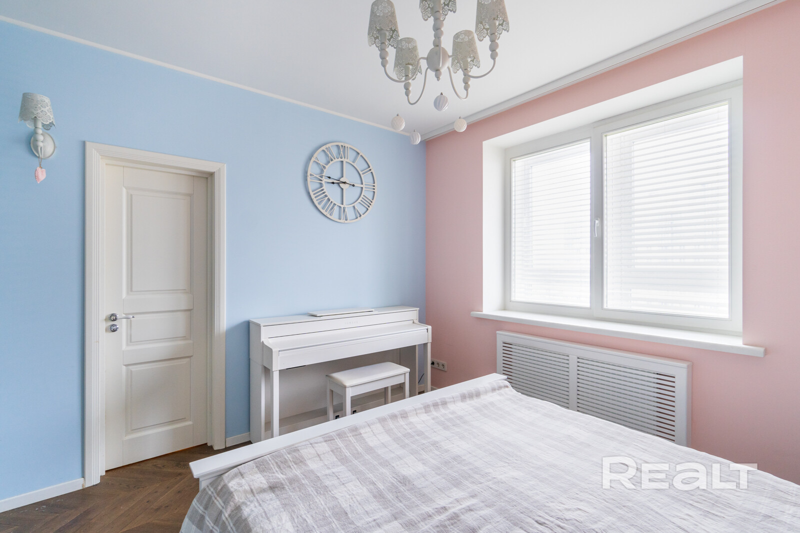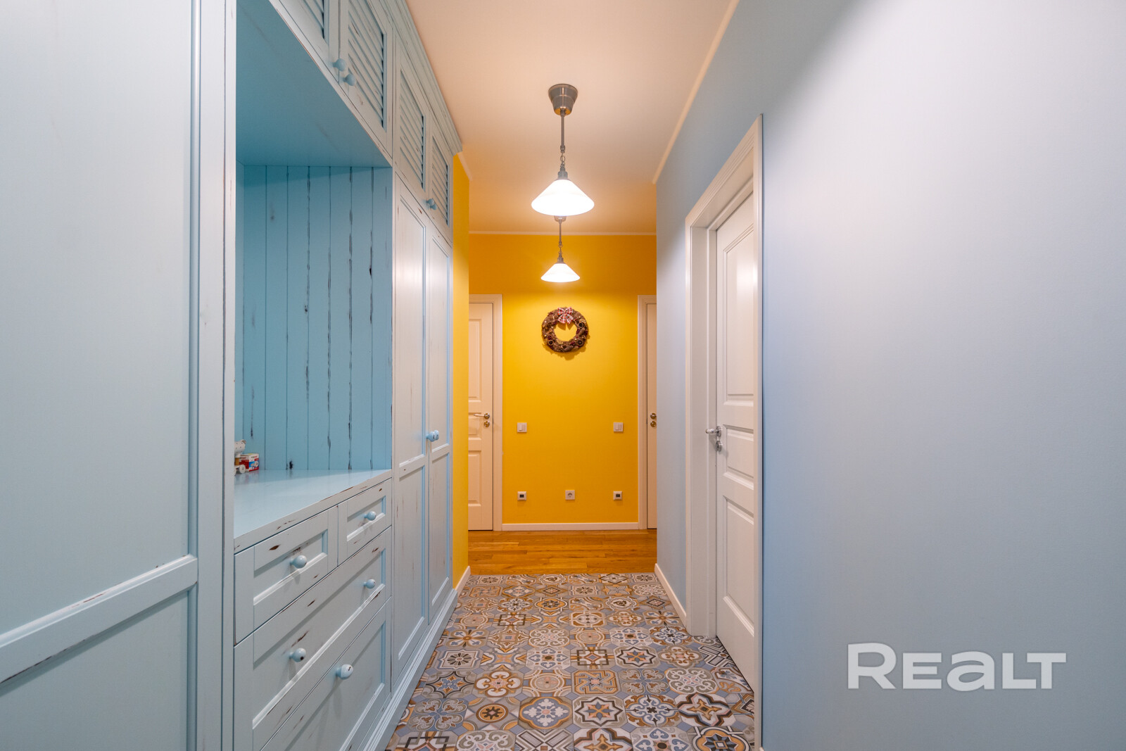 Эта квартира находится в нестаром доме рядом со станцией метро «Грушевка». Интерьер двушки выглядит нежным: стены покрашены в розовый, голубой и желтый цвета. В квартире получилось выделить гардеробную, кабинет и обустроить зону отдыха на лоджии. Показываем, как выглядит это жилье. К слову, в его стоимость входит и парковочное место.