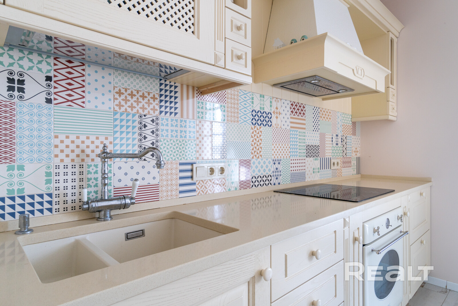 Гарнитур кухни также изготовлен из массива. Здесь уже есть бытовая техника бренда SMEG: варочная панель, духовка, посудомойка и холодильник. Они подчеркивают дизайн кухни и интерьера в целом.