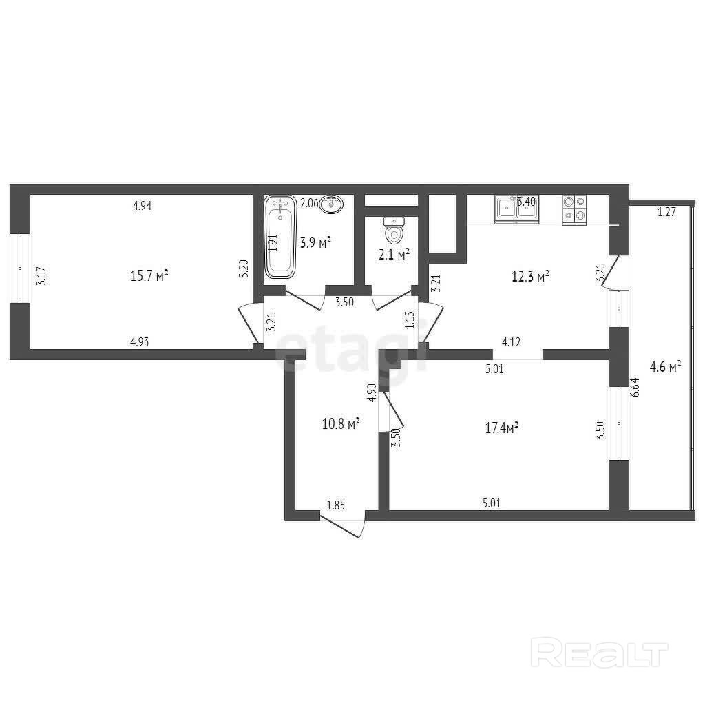 Квартира продается в доме 2014 года постройки на проспекте Дзержинского, 11. Сама высотка имеет 24 этажа, двушка находится на 15-м. Площадь жилья — 66,8 м², кухня занимает 12,3 м².