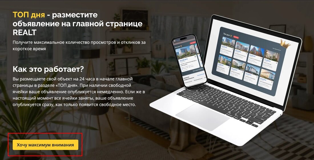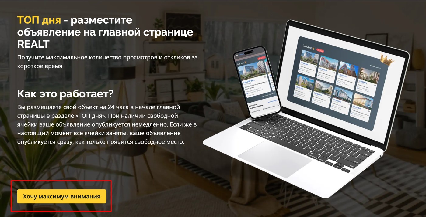 Второй способ — прямо из раздела ТОП Дня на главной странице Realt. Нажимаем на кнопку «Как сюда попасть», попадаем на страницу услуги и жмем на кнопку «Хочу максимум внимания».