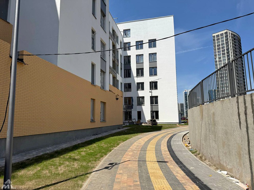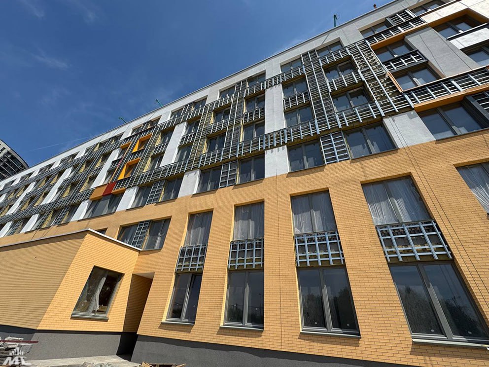 Фасады обоих зданий оформлены декоративной штукатуркой в стиле «лондонский кирпич» и отделаны фиброцементными плитами. Благоустройство территории со стороны улице Кижеватова уже выполнено, осталось завершить участок у проспекта Мира.