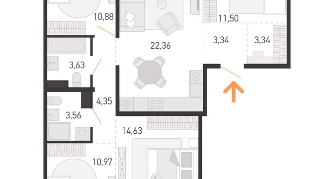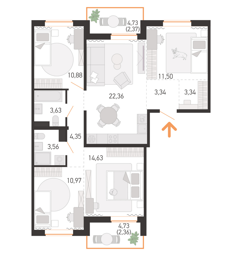 Подъезды в доме будут проходными — с безбарьерной средой, колясочными и помещениями для мытья лап домашних питомцев. Интерьеры выполнят в лаконичной цветовой гамме, украшены ритмичной графикой и паттернами.