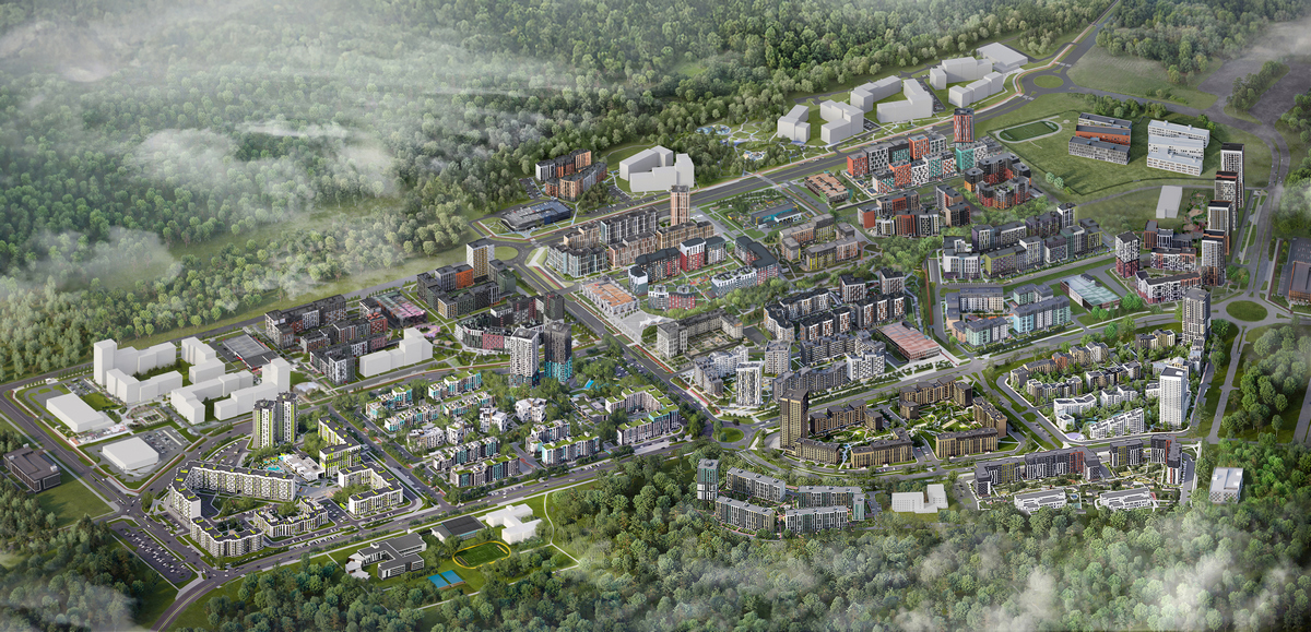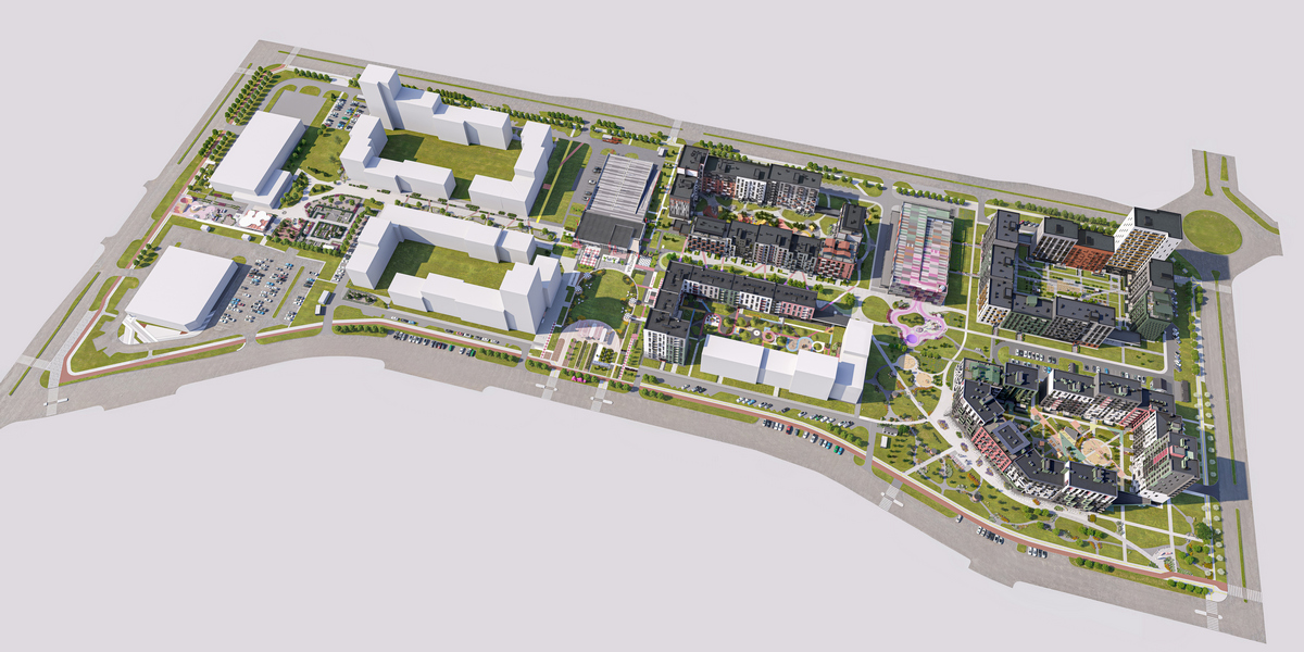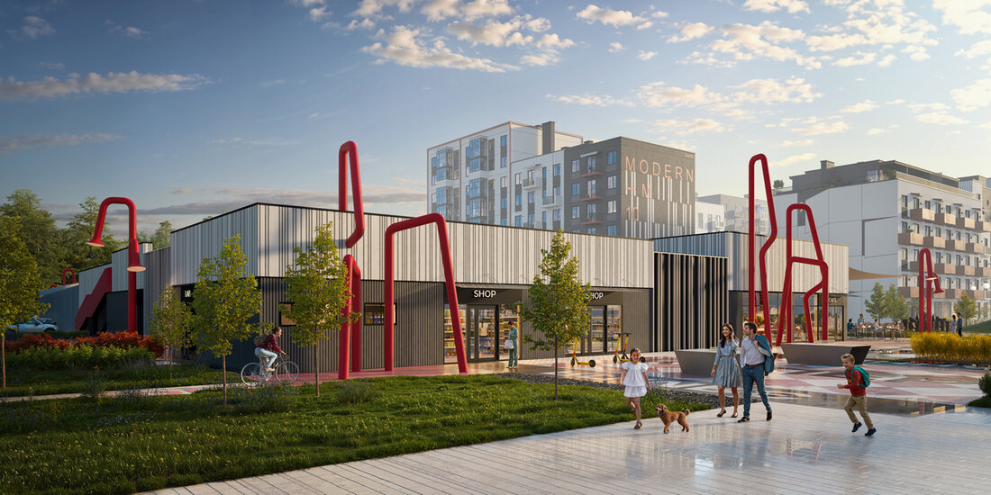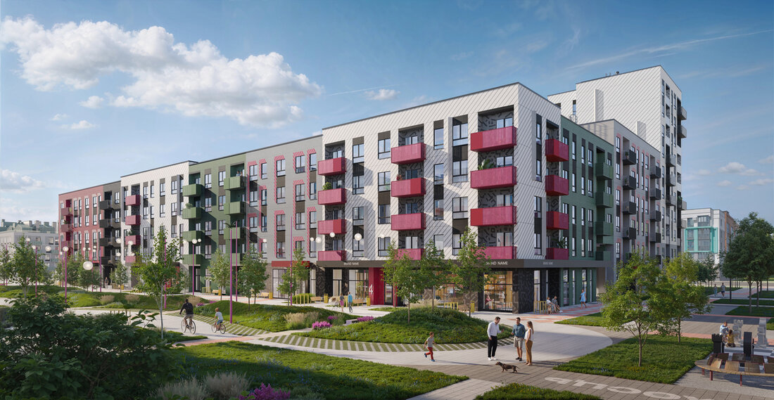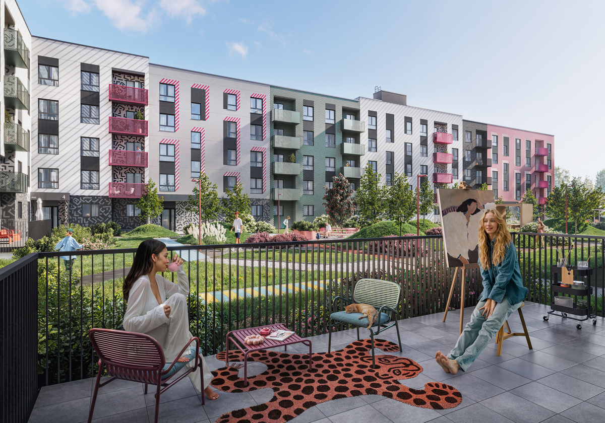 Первый дом в стилистике поп-арта под номером 1.4 по генплану появится в АРТ-квартале. Фасады этого здания получат графические паттерны, полосы, точки и элементы, отсылающие к комиксам.