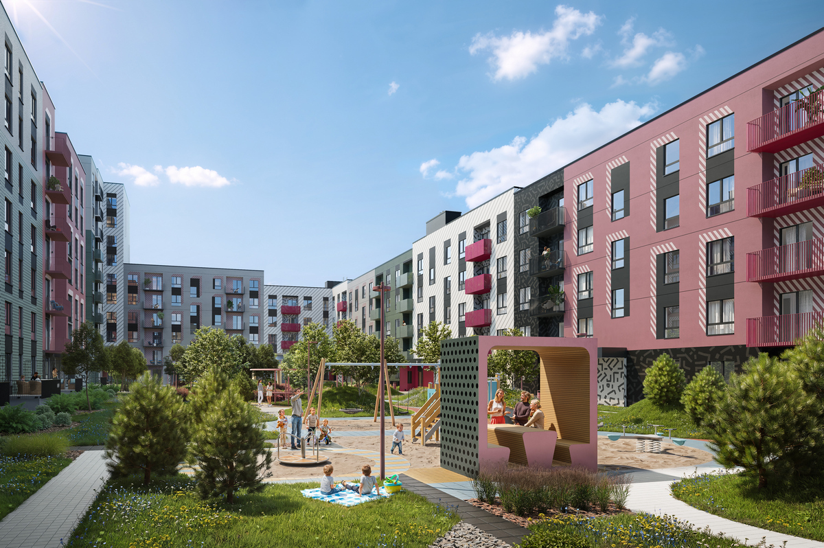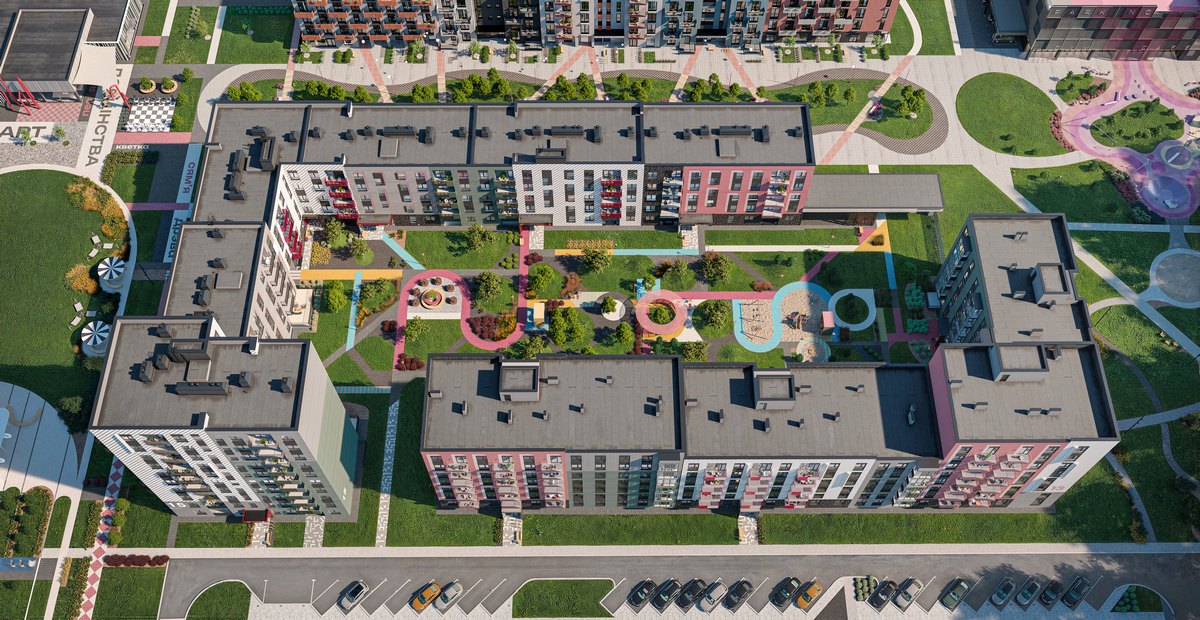 Двор превратят в арт-пространство с круглым навесом для встреч, уличными беседками-офисами и урбан-огородом. Геометрия дорожек, холмы и яркие элементы делают его хорошим местом для отдыха. Для большей безопасности — видеонаблюдение в подъездах, во дворе и по периметру квартала.