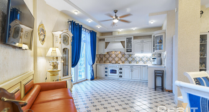 Первая квартира — 120-метровая трешка, которая расположилась на шестом этаже дома. В этой квартире сделан шикарный ремонт в стиле рококо. Жилье состоит из кухни-столовой, гостиной, двух спален, двух санузлов и гардеробной.