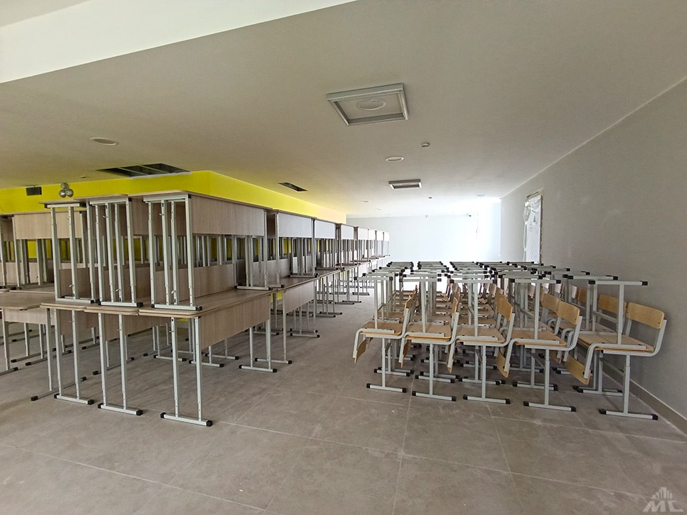 Классы практически готовы к приему учеников — осталось расставить мебель, которая активно завозится и собирается. В просторном спортзале уже уложено напольное покрытие и смонтированы баскетбольные щиты и штанги для волейбольных сеток. В актовом зале специалисты приступили к укладке паркета. Испытания вентиляционных установок прошли успешно, подтвердив их бесперебойную работу.