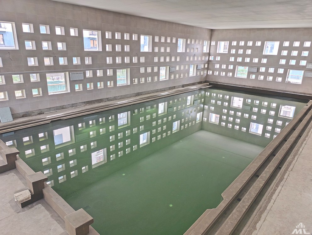 Уникальной особенностью новой школы станет отдельно стоящий бассейн с трибунами на 100 мест. В малом бассейне (6×10 м) уже уложена плитка, а в большом (25×11 м) проводятся испытания гидроизоляции перед началом облицовочных работ. Параллельно завершается отделка раздевалок и административно-технических помещений.