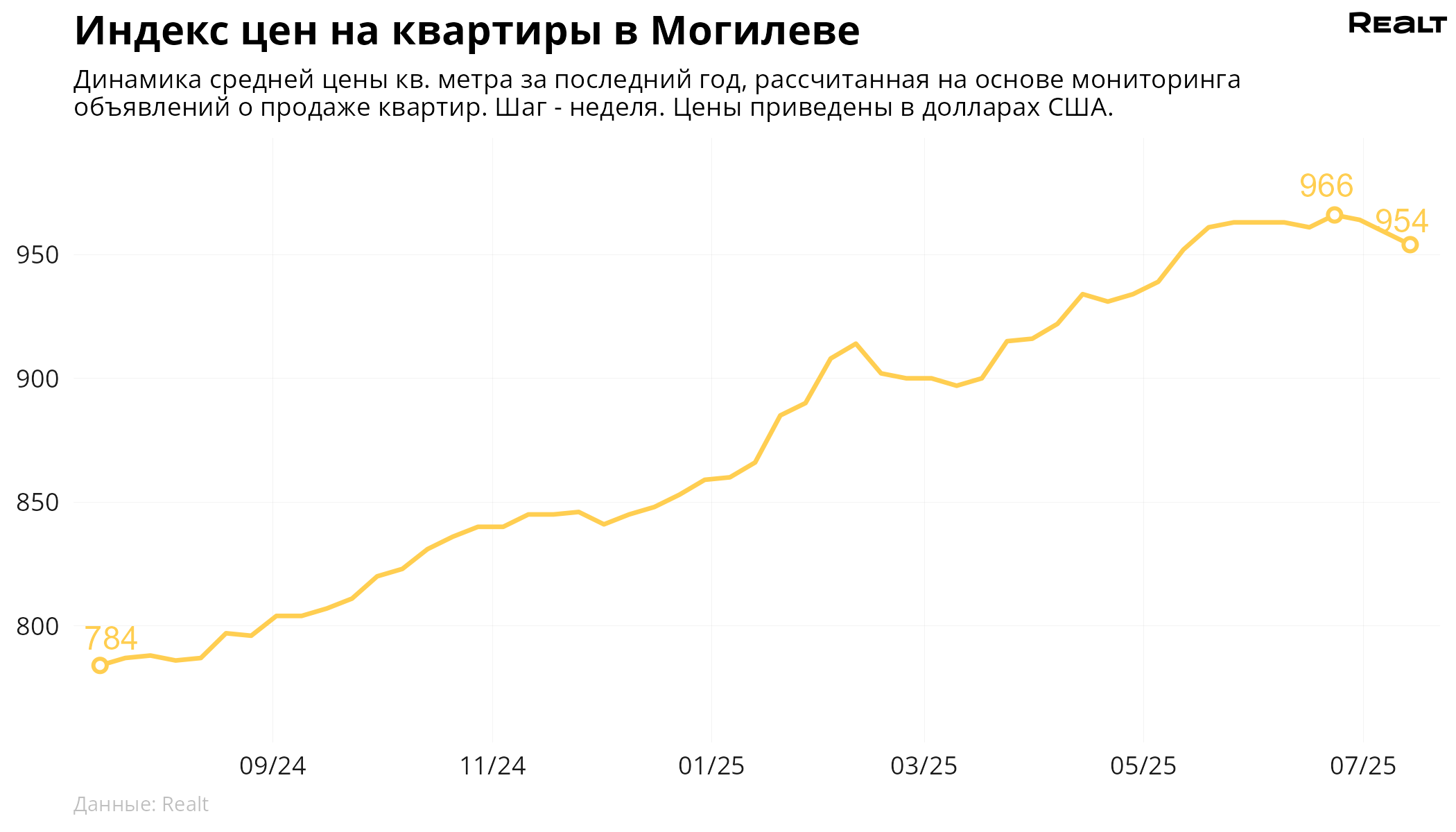 За неделю, с 7 по 14 июля 2025 года, средняя цена в объявлениях о продаже квартир в Могилеве снизилась на 0.5% и составила 954 $/м2. При этом количество квартир в продаже уменьшилось на 2.2%. Что еще произошло на рынке жилья крупнейших городов Могилевской области за семь дней — в материале.