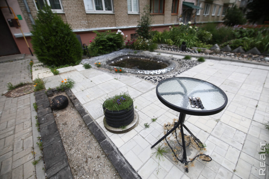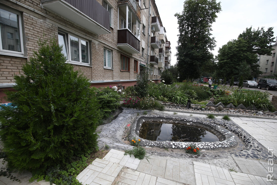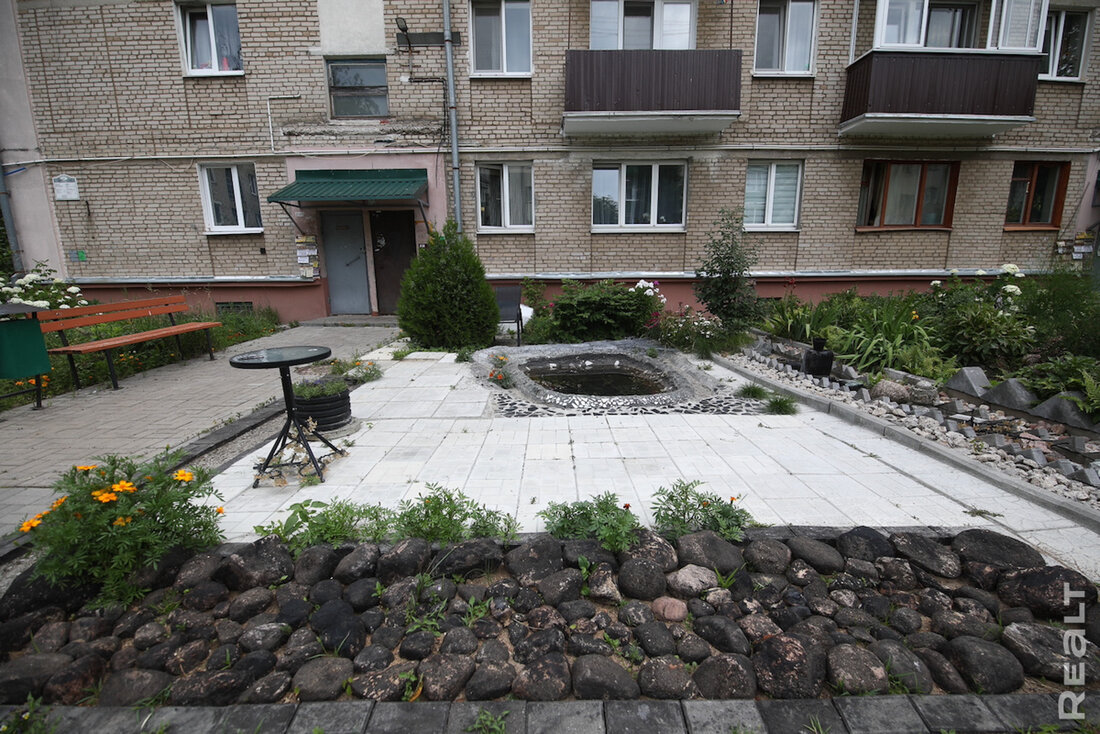 Эта хрущевка на Волоха, 21 в микрорайоне минской «Розочки» вряд ли могла бы привлечь внимание журналистов, если бы не необычный двор у первого подъезда. Кроме цветов здесь появился пруд с водой и самый разный декор.