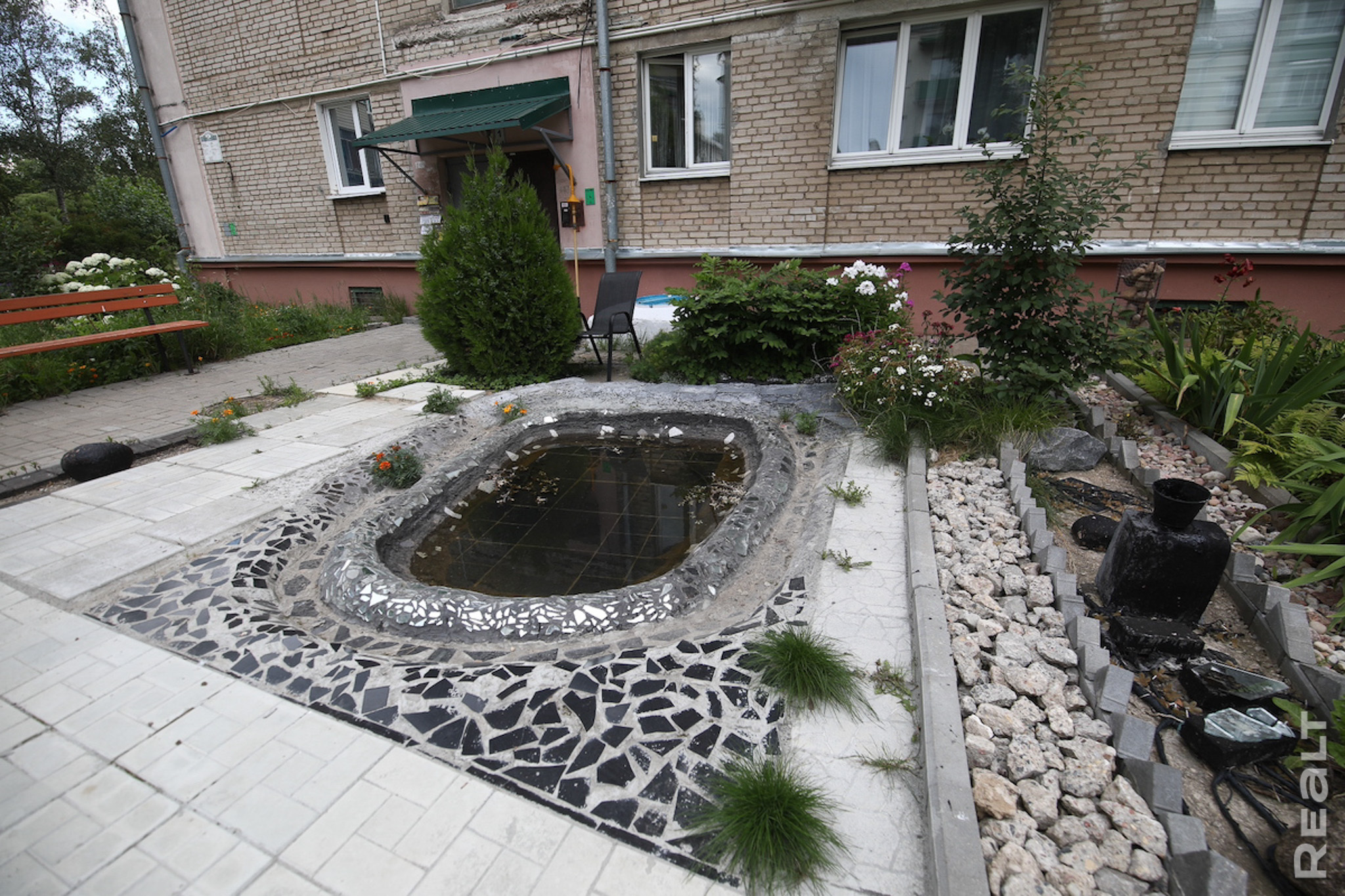 Эта хрущевка на Волоха, 21 в микрорайоне минской «Розочки» вряд ли могла бы привлечь внимание журналистов, если бы не необычный двор у первого подъезда. Кроме цветов здесь появился пруд с водой и самый разный декор.