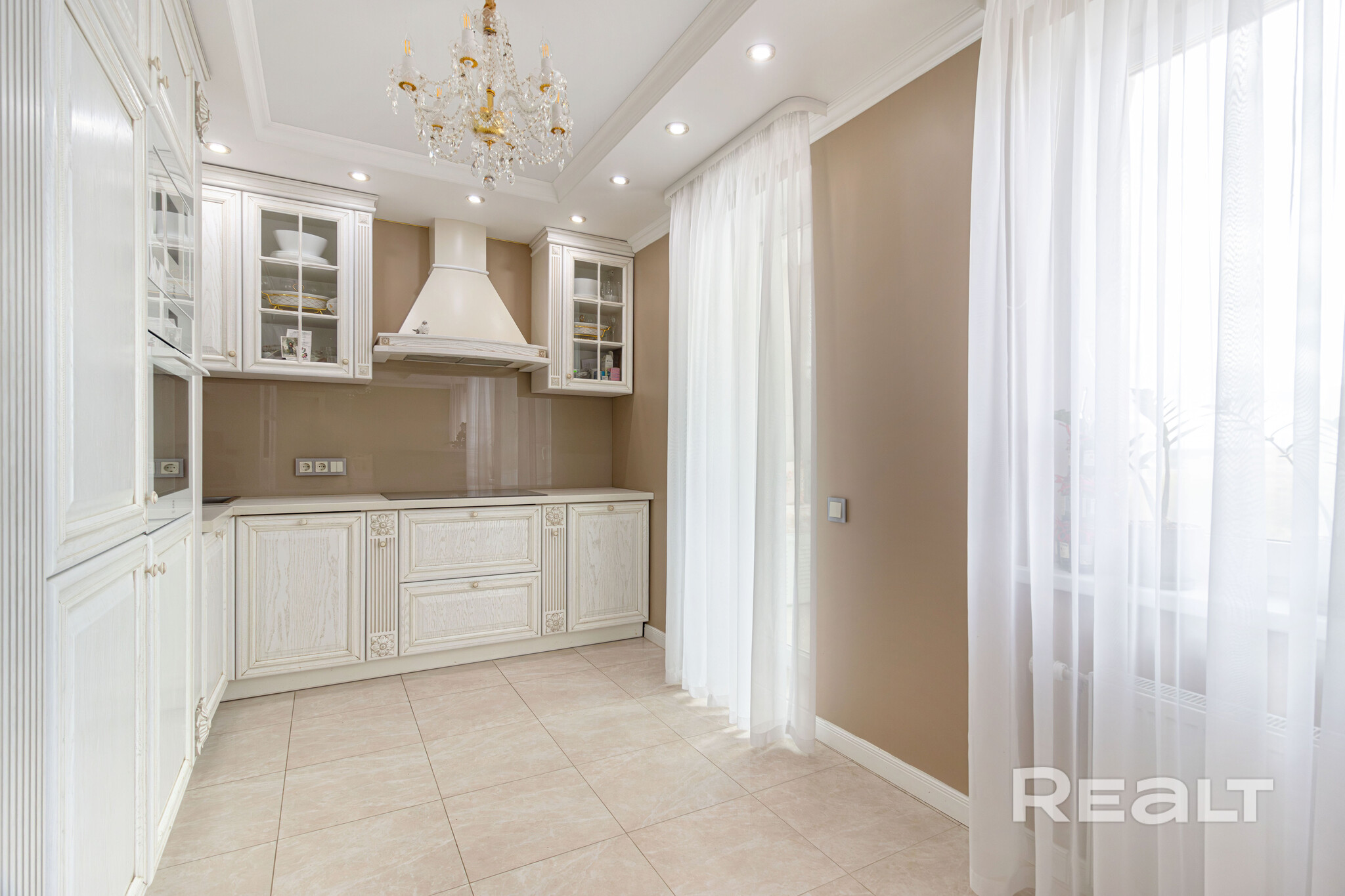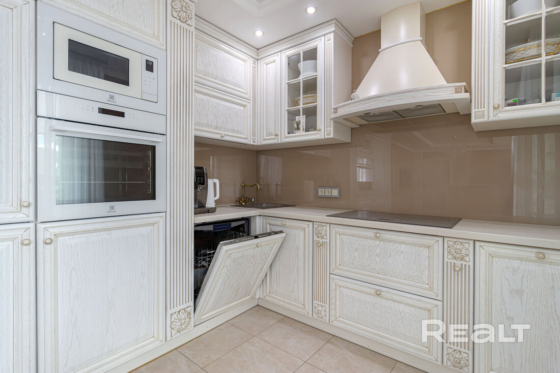 В объявлении упоминается дубовая кухня, итальянская плитка, металлическая входная дверь, а также микроволновая печь, духовой шкаф, индукционная варочная поверхность, посудомоечная машина, холодильник и стиральная машина.