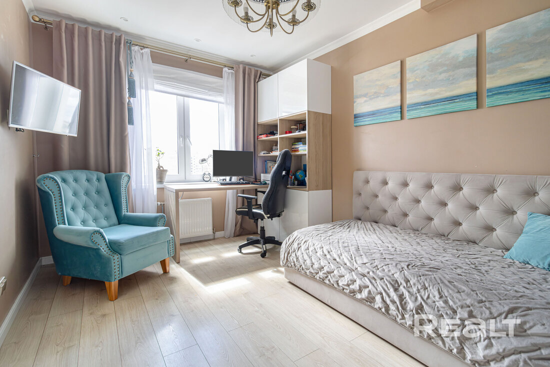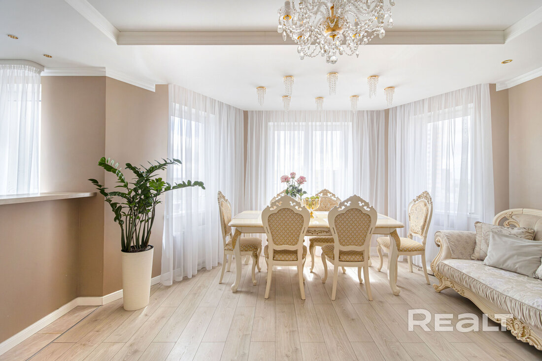 Судя по всему, в квартире была перепланировка. На выделенной площади удалось организовать кухню, элегантную гостиную (со столовой зоной в эркере) и две спальные комнаты. Жилье полностью готово к проживанию и продается с мебелью и техникой.