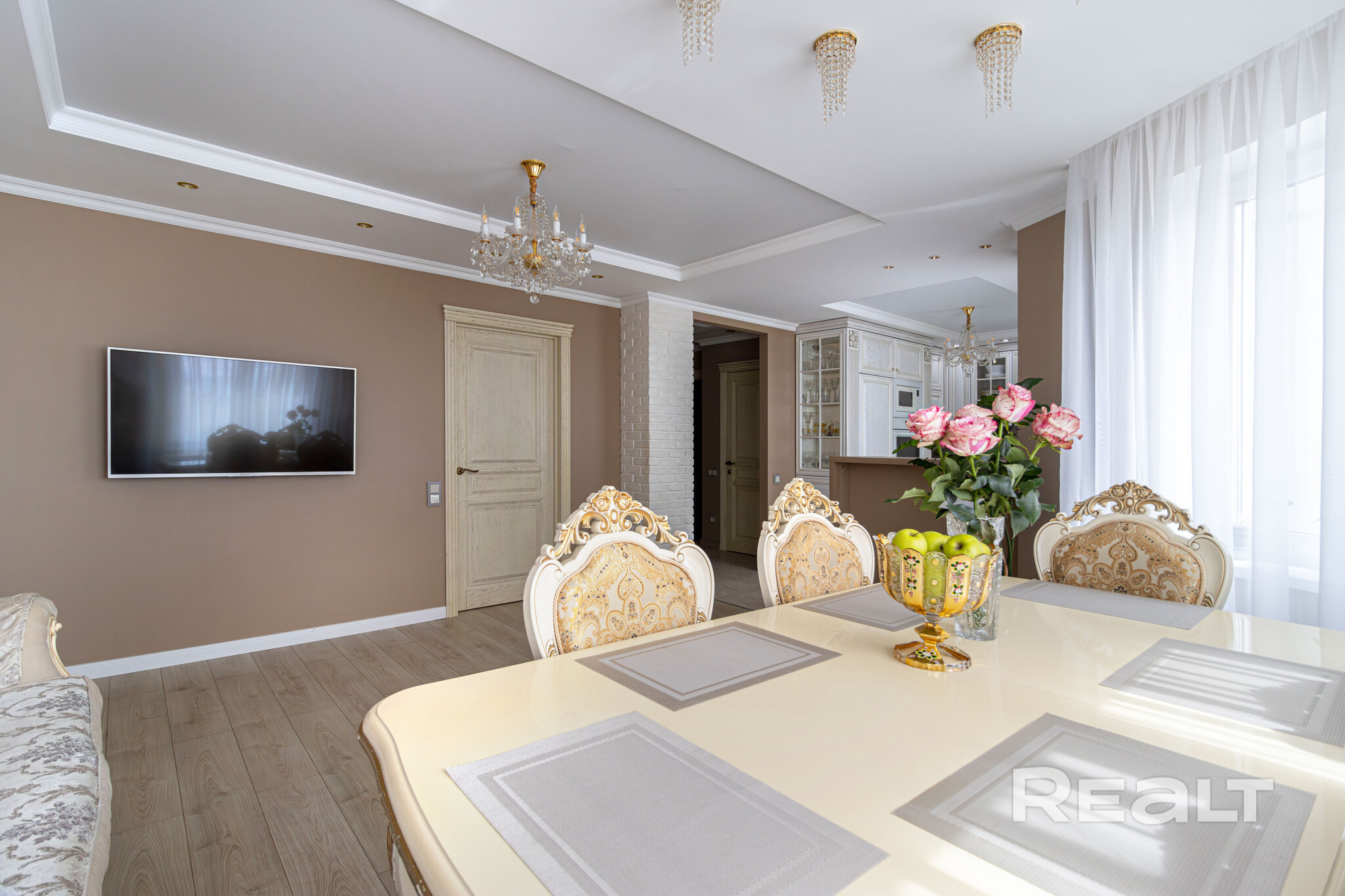 Сейчас тут продается всего одна квартира, зато какая! В двушке площадью 68 квадратных метров сделан шикарный ремонт. Тут и классическая «дворцовая» мебель, и натуральные материалы, и роскошные люстры, и позолота, и зеркала, и текстиль.