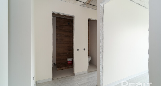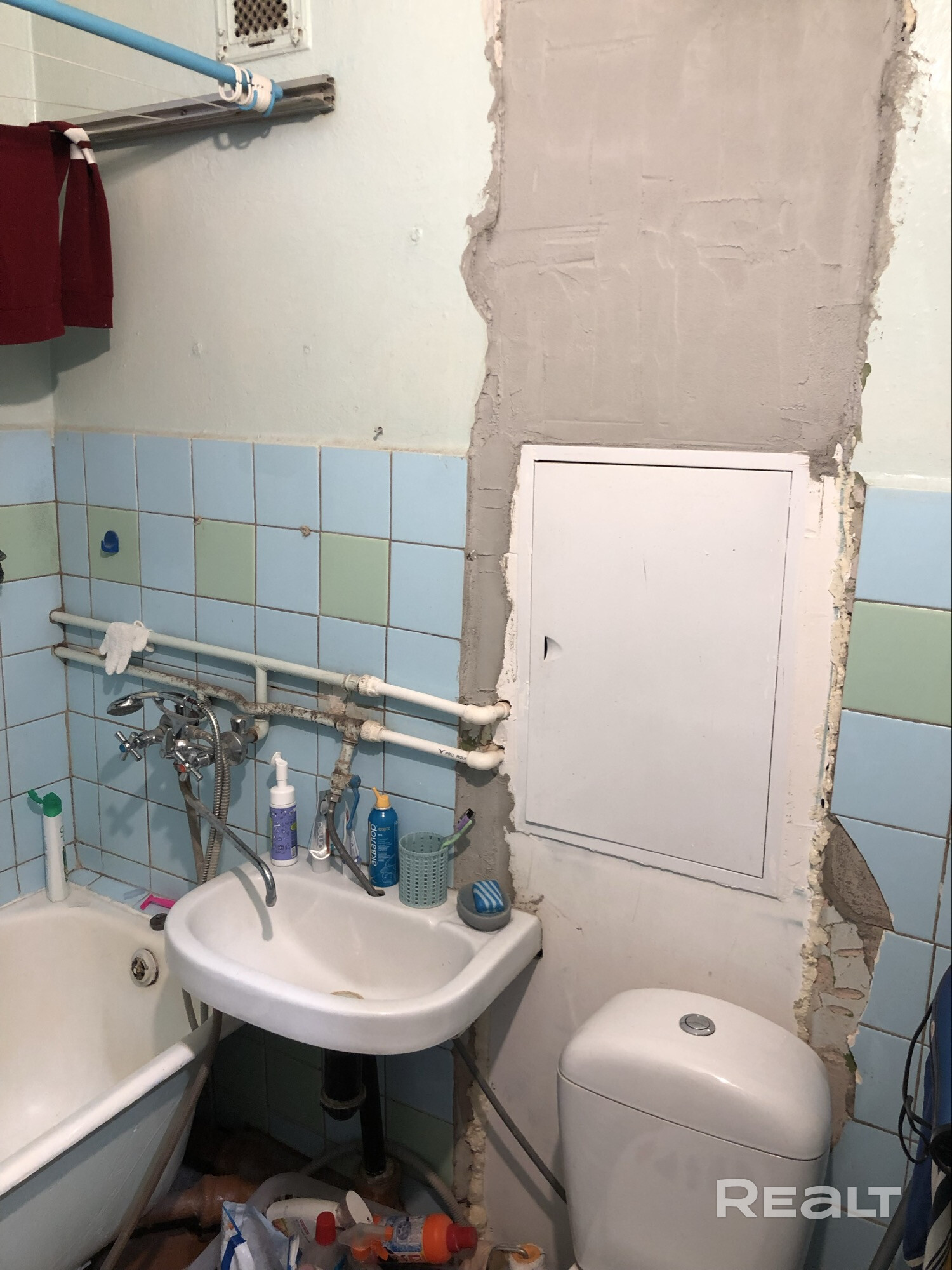 Квартира нуждается в ремонте. Высота потолков достигает 3 м. В окнах установлены стеклопакеты ПВХ, на полу лежит доска. Санузел здесь совмещенный.