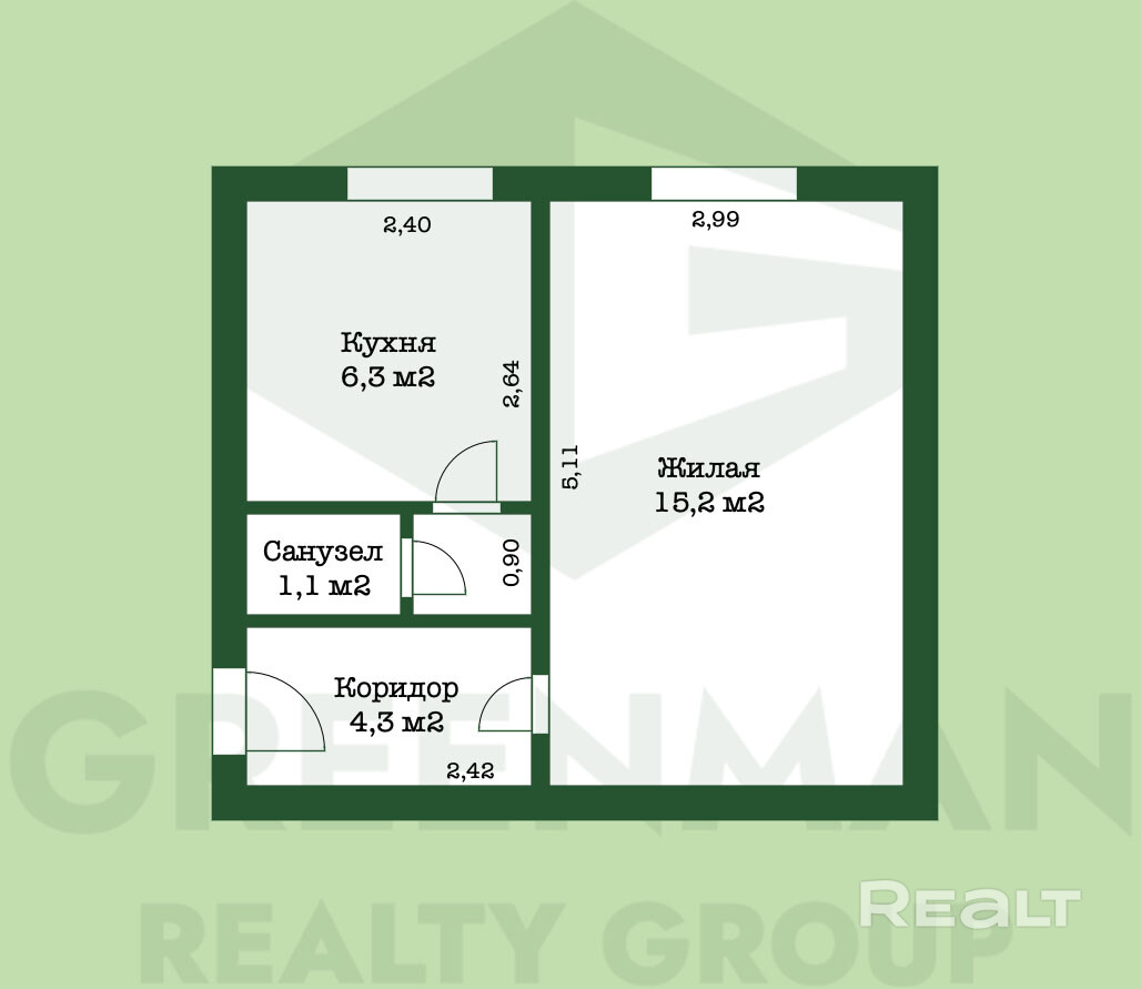 Вторая квартира располагается на первом этаже этого дома. Она больше, чем предыдущая — 33,4 м². Под кухню выделено 7,6 м².