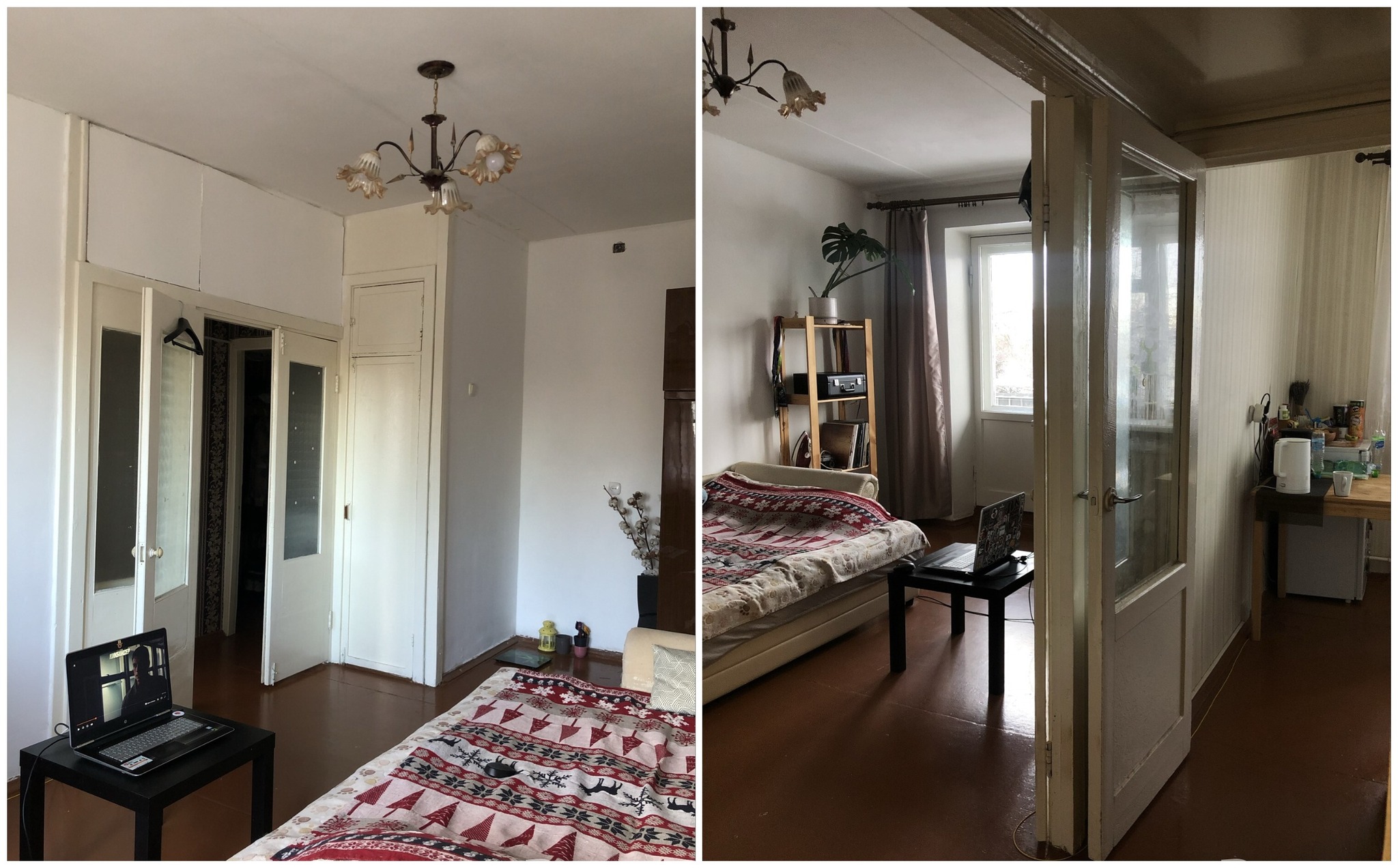 Эта квартира также идет под ремонт. На полу лежит дерево. В комнате есть небольшая ниша под хранение вещей. Также имеется балкон.