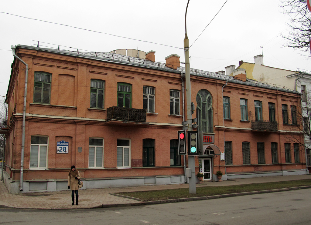 У этого дома из красного кирпича двойной адрес — Киселева, 28/Богдановича, 24. Здание построили еще в конце XIX века. Историки рассказывают, что в доме жил управляющий завода «Аливария». Во время войны дом практически полностью сгорел, а после того как его восстановили, здесь были коммуналки.