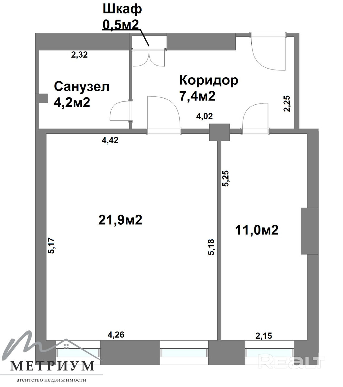 Общая площадь — 45 квадратов, жилая — 22, кухня — 11 квадратов. Вот планировка.