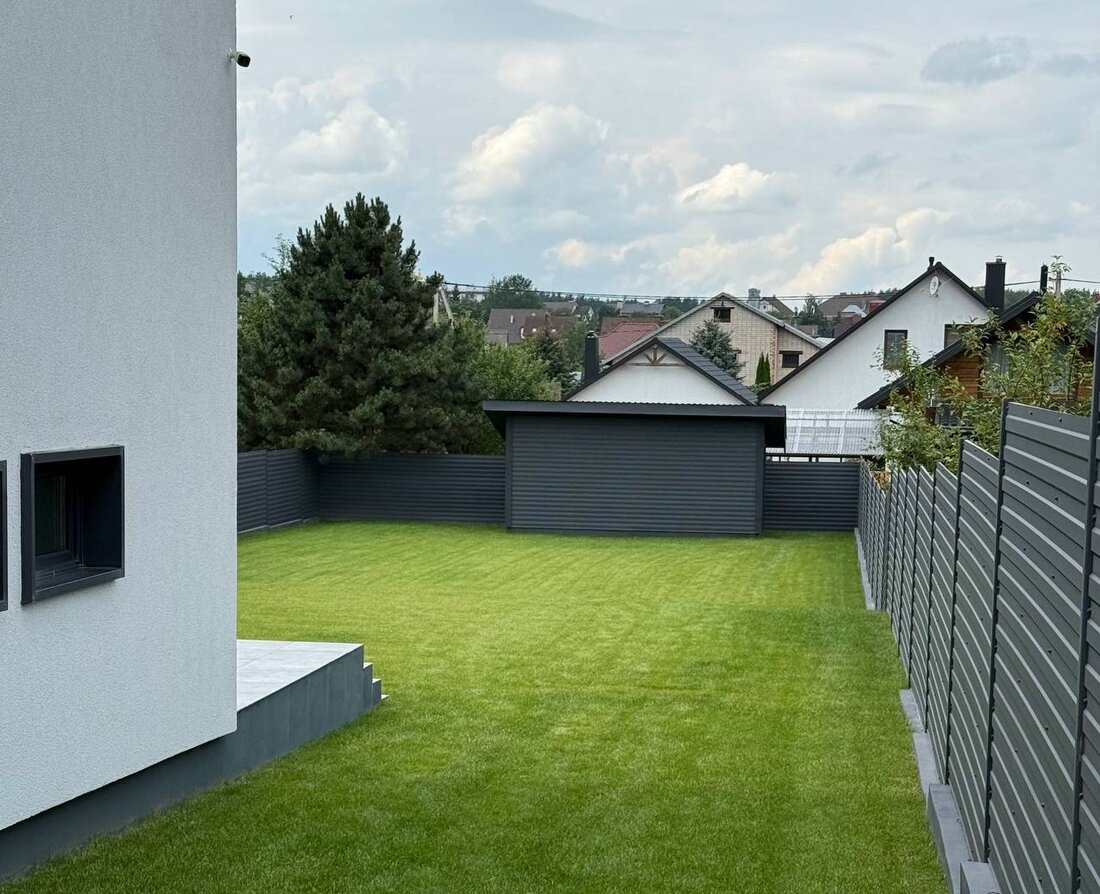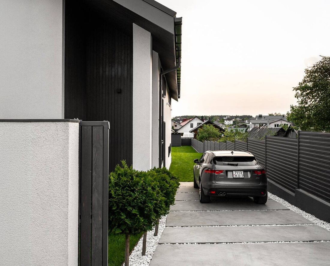 - Отмостка вокруг дома скрытая, парковка — бетон