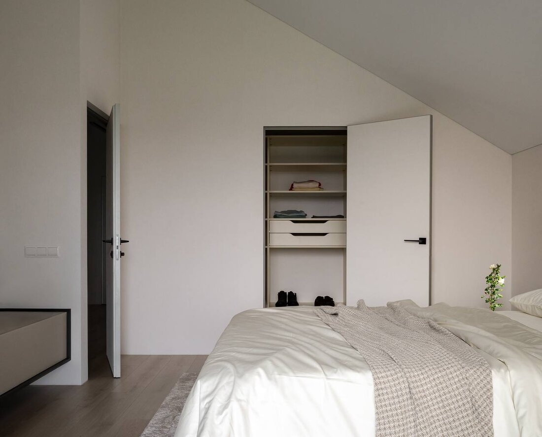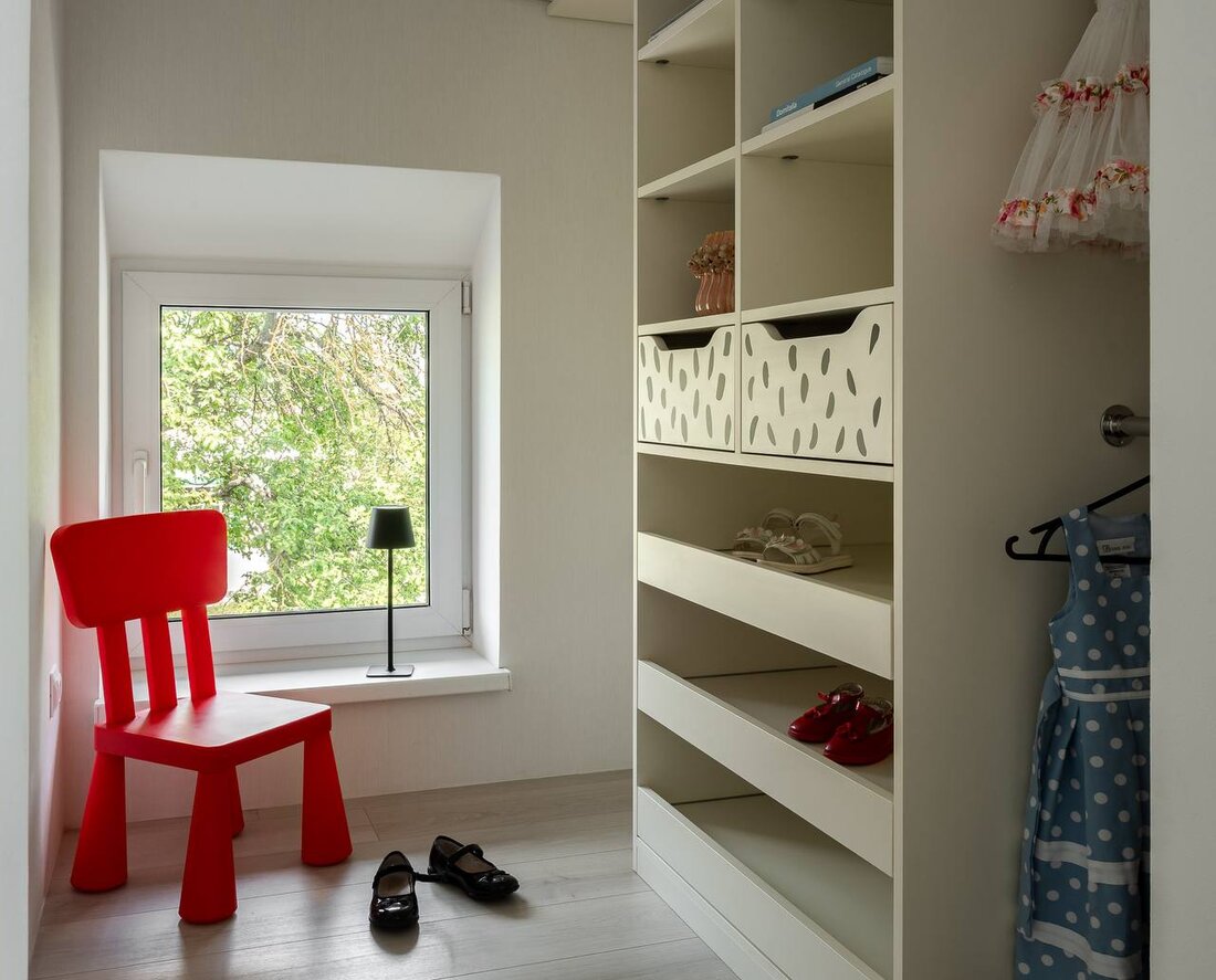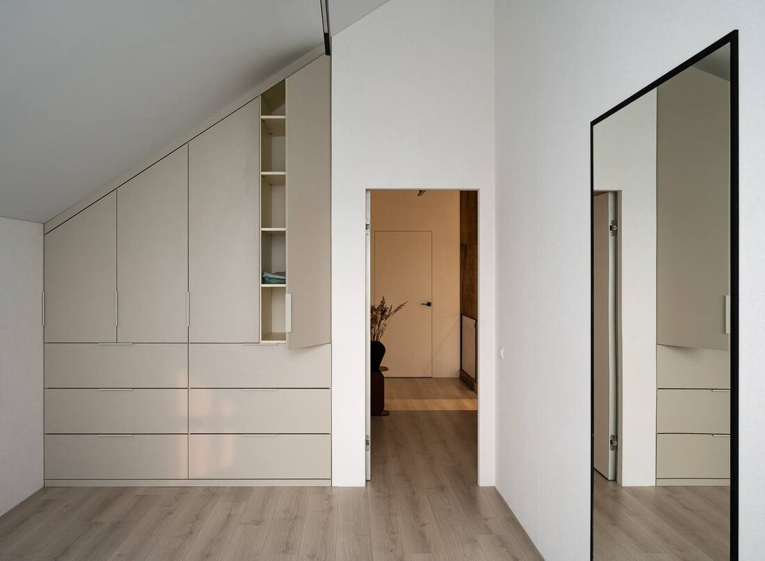 Под крышей расположены три спальни. Одна из них детская с гардеробной для дочек Дмитрия — Маша Бергер придумала для нее специальный дизайн.