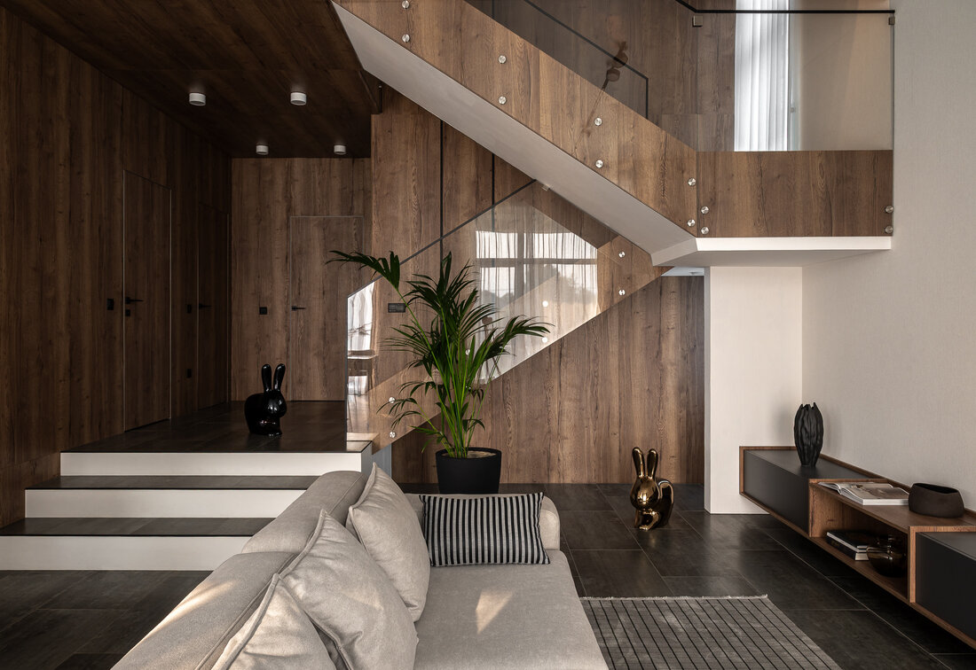 Архитектурный облик дома Дмитрия, безусловно, впечатляет, но не менее важен и внутренний мир. Как признается сам хозяин, в создании интерьера ему помогали два талантливых специалиста: архитектор Александр Донской и дизайнер Маша Бергер, привнесшая в интерьер нотки дорогого итальянского минимализма.