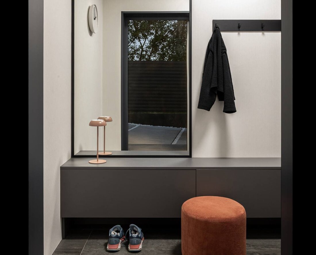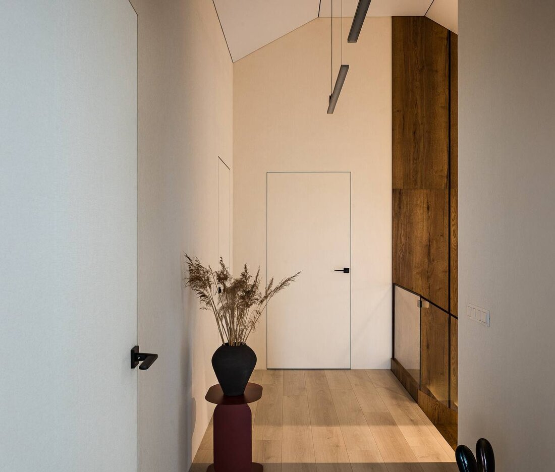 Общая площадь дома — 178 квадратов. На первом этаже находятся прихожая, топочная, большой санузел, гостиная с кухонной зоной, панорамными окнами и выходом на террасу. В отделке стен здесь использовались тонкие панели ДСП Egger — благодаря точной подгонке, стыки практически не заметны и выглядит все очень привлекательно. Двери-невидимки отделаны теми же панелями, поэтому о их существовании можно догадаться лишь по дверным ручкам.