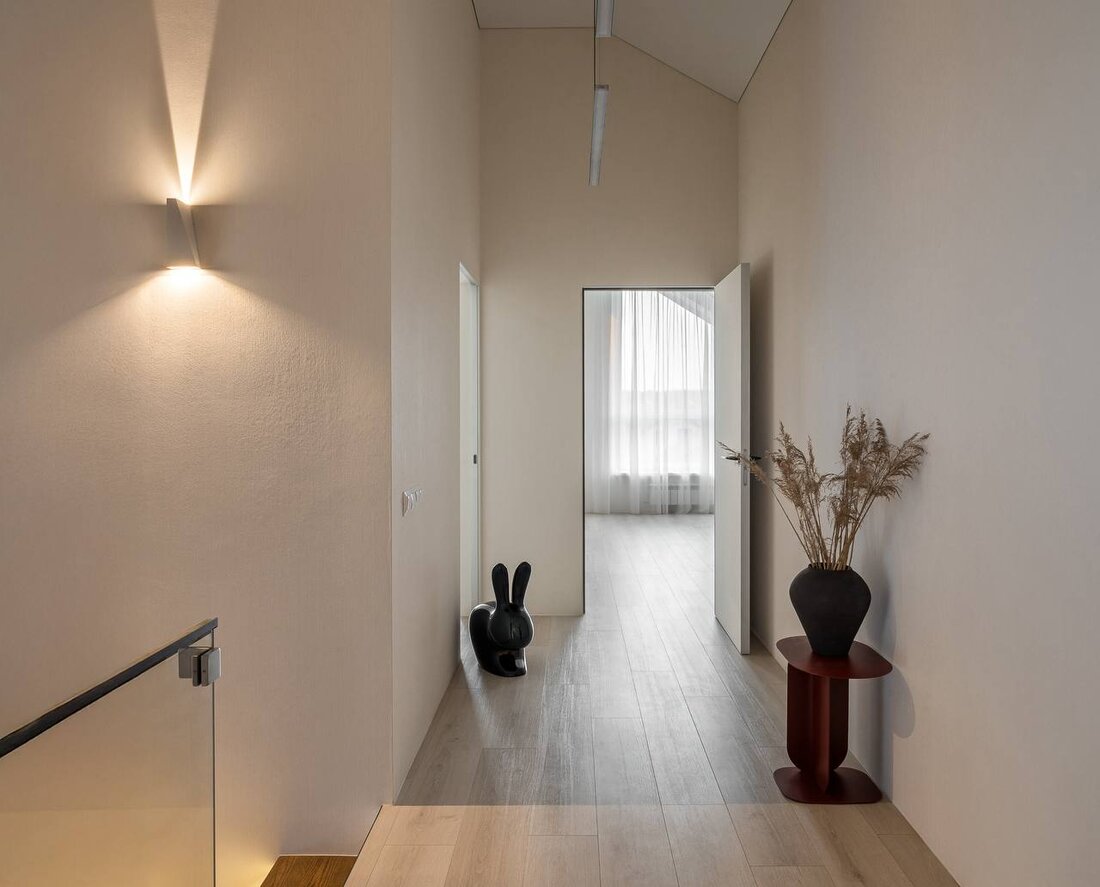 Большое внимание уделено освещению — в доме много естественного света, благодаря панорамным окнам и грамотно расположенным светильникам.