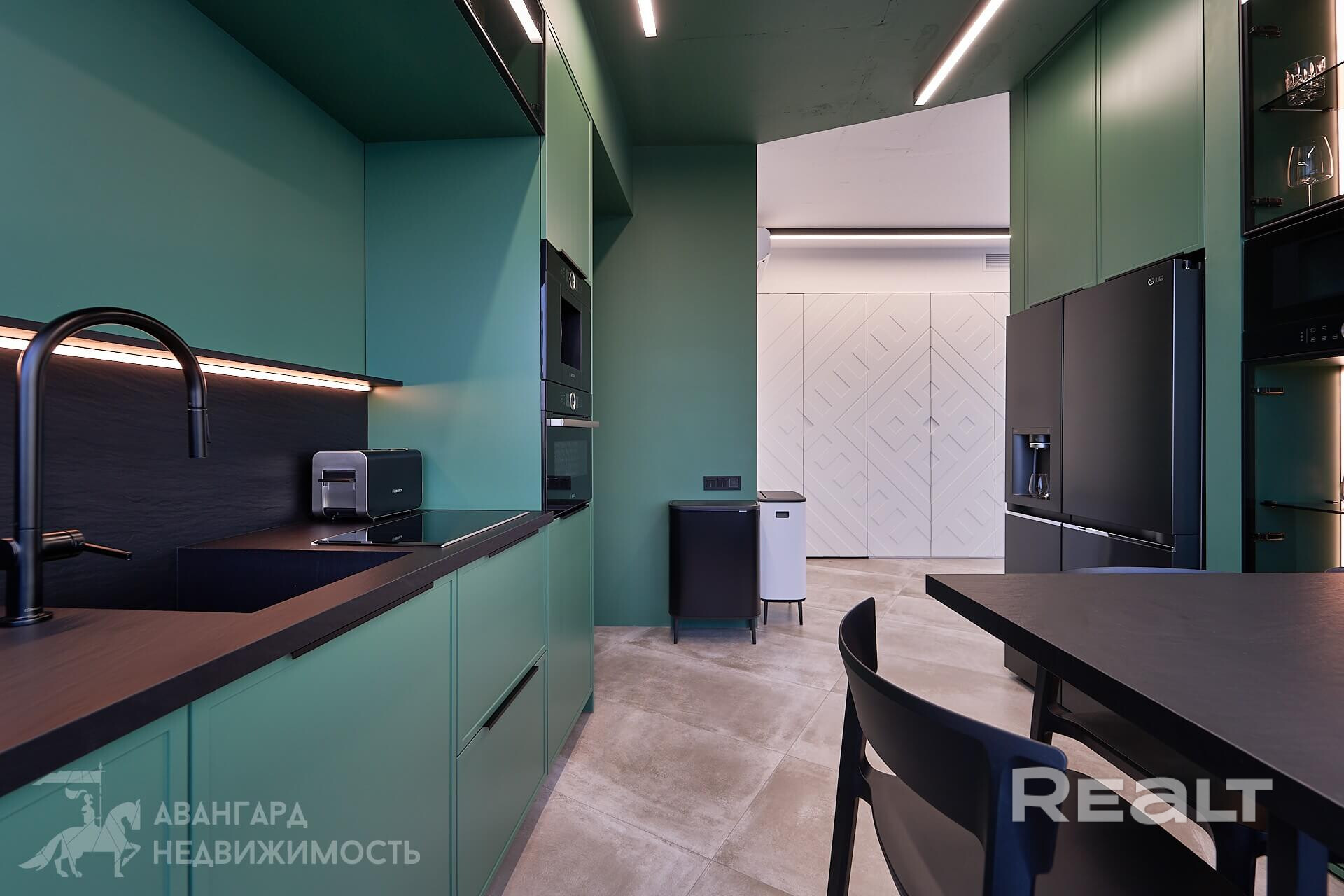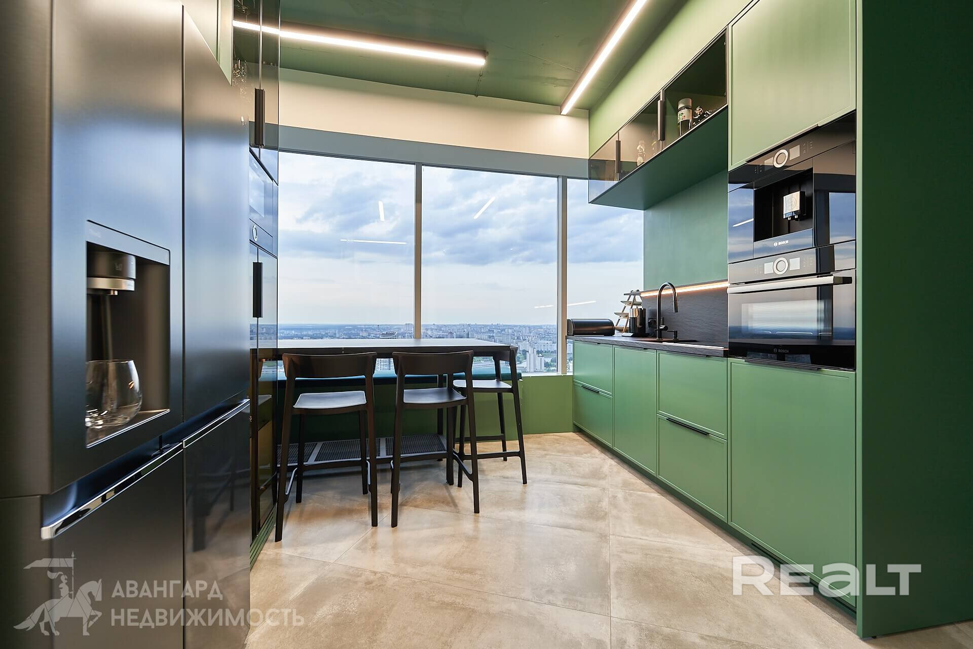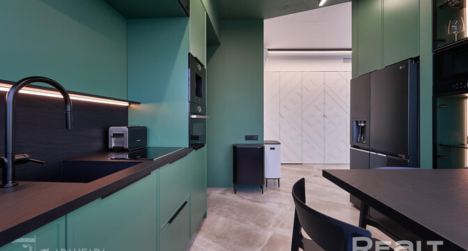 Кухня, совмещенная с гостиной занимает почти 50 квадратов. Кухонные фасады выполнены в акцентном зеленом цвете. А ремонт в квартире в нейтральных цветах.