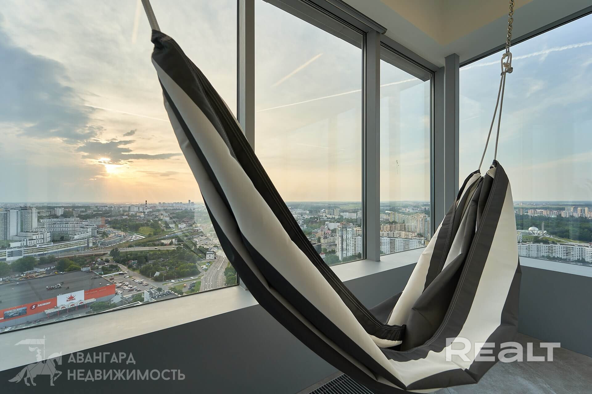 Интересная особенность этой квартиры в том, что панорамные окна идут по периметру — и во всех жилых комнатах, и в ванной. Отсюда окрывается красивый вид на город. А еще в гостиной рядом с окном подвешен гамак.
