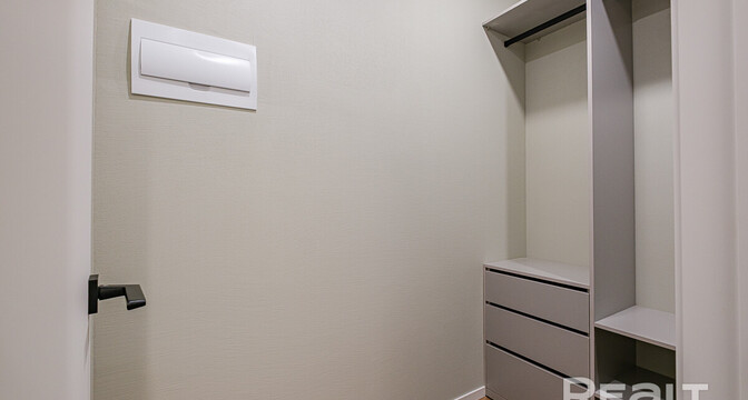 Площадь спальни — 15 метров. Санузел совмещенный. Установлена душевая, есть бойлер и стирально-сушильная машина. Также в квартире есть гардеробная.